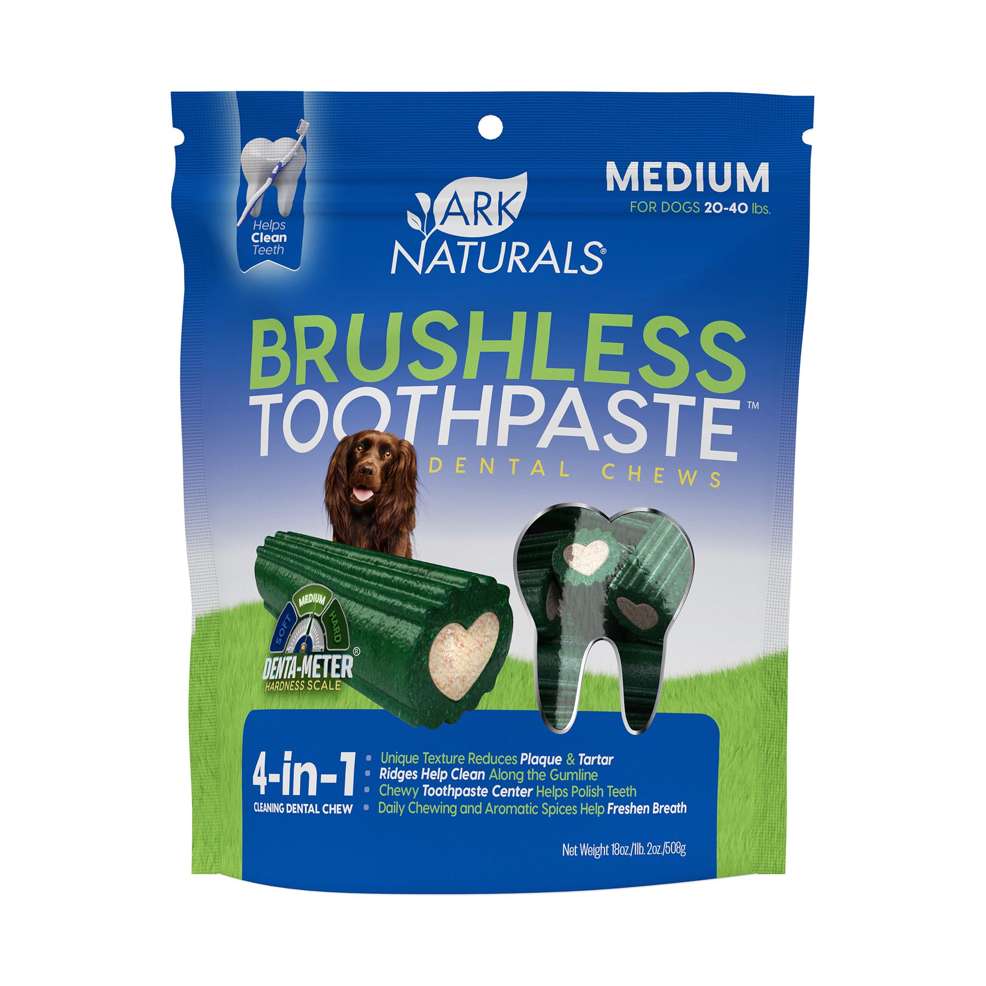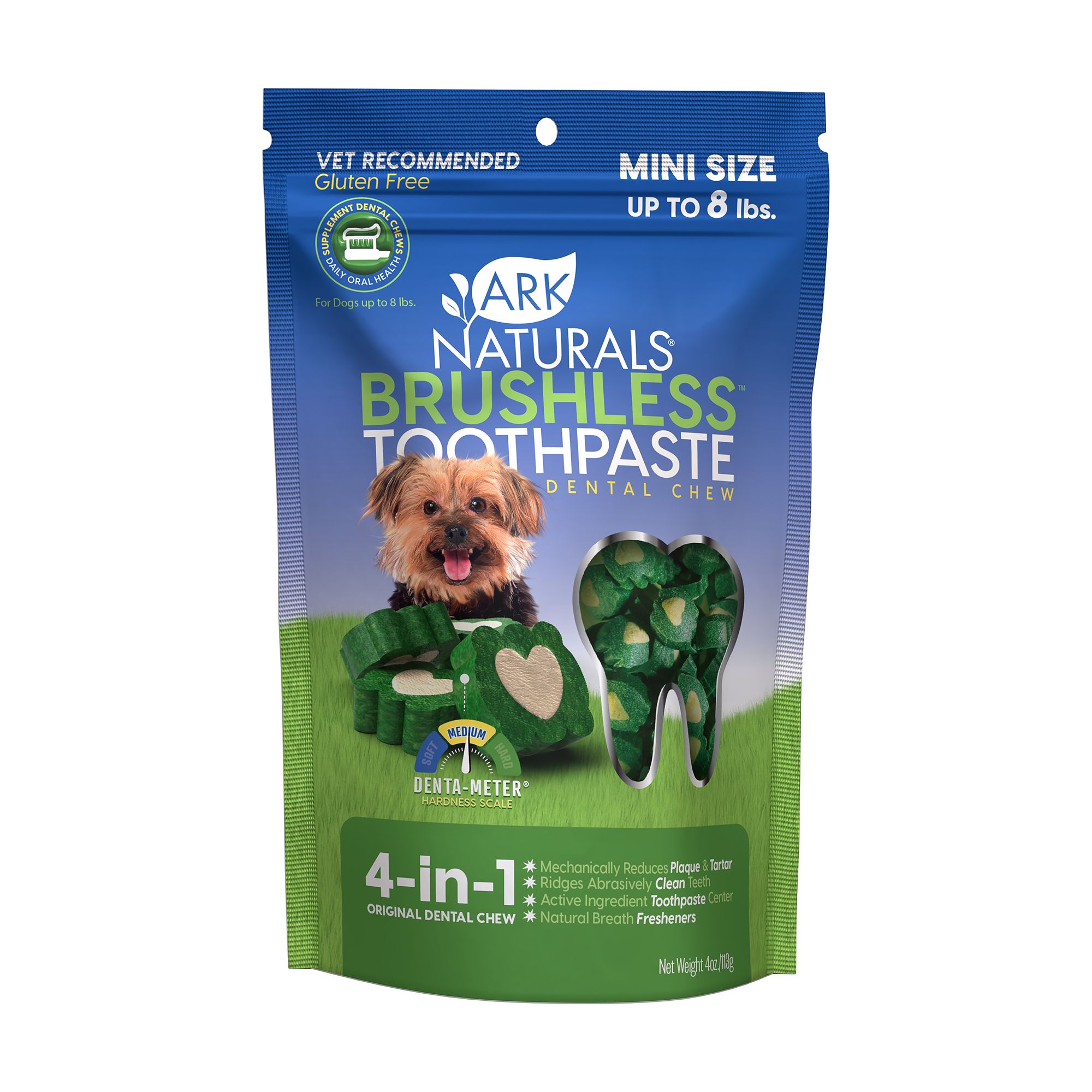 Keeping your pup healthy from tooth to tail is easy with Ark Naturals Brushless Toothpaste dental chews. Say goodbye to bad dog breath and hello to clean teeth with our tried and true formula that uses real dental ingredients. Every time your pup chews he does the cleaning for you; the unique texture reduces plaque and tartar and the ridges help clean along the gumline. Enjoy the only 4-in-1 dental chew with a chewy toothpaste center that polishes, just like your own toothpaste. Daily chewing and aromatic spices freshen breath and are recommended up to twice a day!