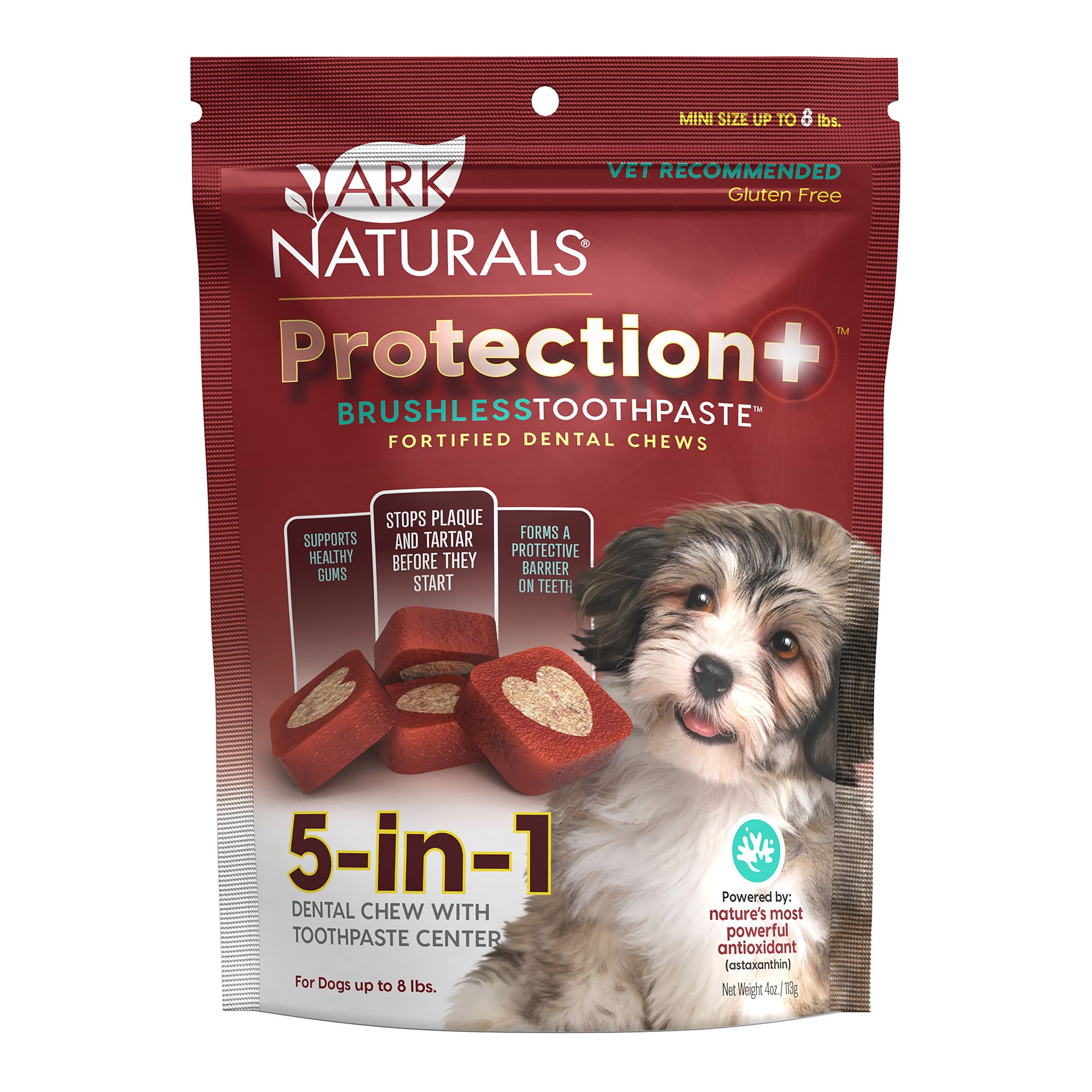 Ark Naturals Protection+ Brushless Toothpaste is the only dental chew that stops plaque and tartar before they start! Powered by nature's most powerful antioxidant: Astaxanthin. Astaxanthin stops plaque and tartar before it can even start by boosting the antibody immunoglobulin A (lgA) in the saliva, therefore creating a protective barrier on teeth! Our unique 5-in-1 dental chews have a toothpaste center with active ingredients and natural breath fresheners such as cinnamon, clove and vanilla. Our dental chews also support gums with antioxidant power and form a protective barrier to support healthy teeth.
