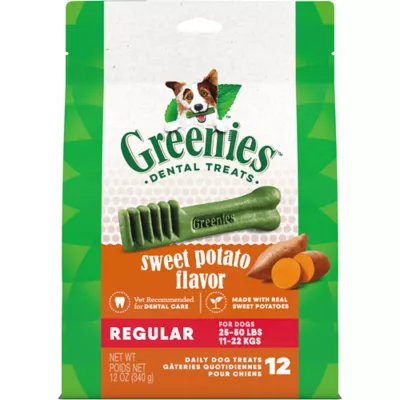 Perfect Dog Treats For Daily Dental Care: Greenies natural dog teeth cleaning treats are crafted to support the 4 areas veterinarians check most: plaque, tartar, gums, & breath and are made with natural ingredients plus vitamins, minerals & nutrients.Veterinarian–Recommended Dog Dental Treats: Greenies Dental Dog Treats are veterinarian–recommended dental treats for dogs that clean teeth and freshen breath.Dental Chews For Dogs Fights Tartar: Including Greenies teeth cleaning dog treats into your daily dog dental care routine supports 47% less tartar accumulation and 40% less plaque accumulation in 28 days (Data on file).Clinically Proven Dog Teeth Cleaning Treat: This dog dental chew offers clinically proven dog dental care to help maintain your four–legged friend's oral hygiene.Unique Texture For Dog Teeth Cleaning: Made for a dog between 25–50 lbs., these Greenies dog treats have a unique design that cleans down to the gumline with a taste your dog will love.Oral Hygiene Chews For Dogs: Greenies dog dental treats positively balance the oral microbiome to help support whole–body health.12 oz. Pack: Contains one (1) 12 oz. pack of Greenies Adult Dental Dog Treats Regular Size, Sweet Potato Flavor, 12 Count.Species: Dog