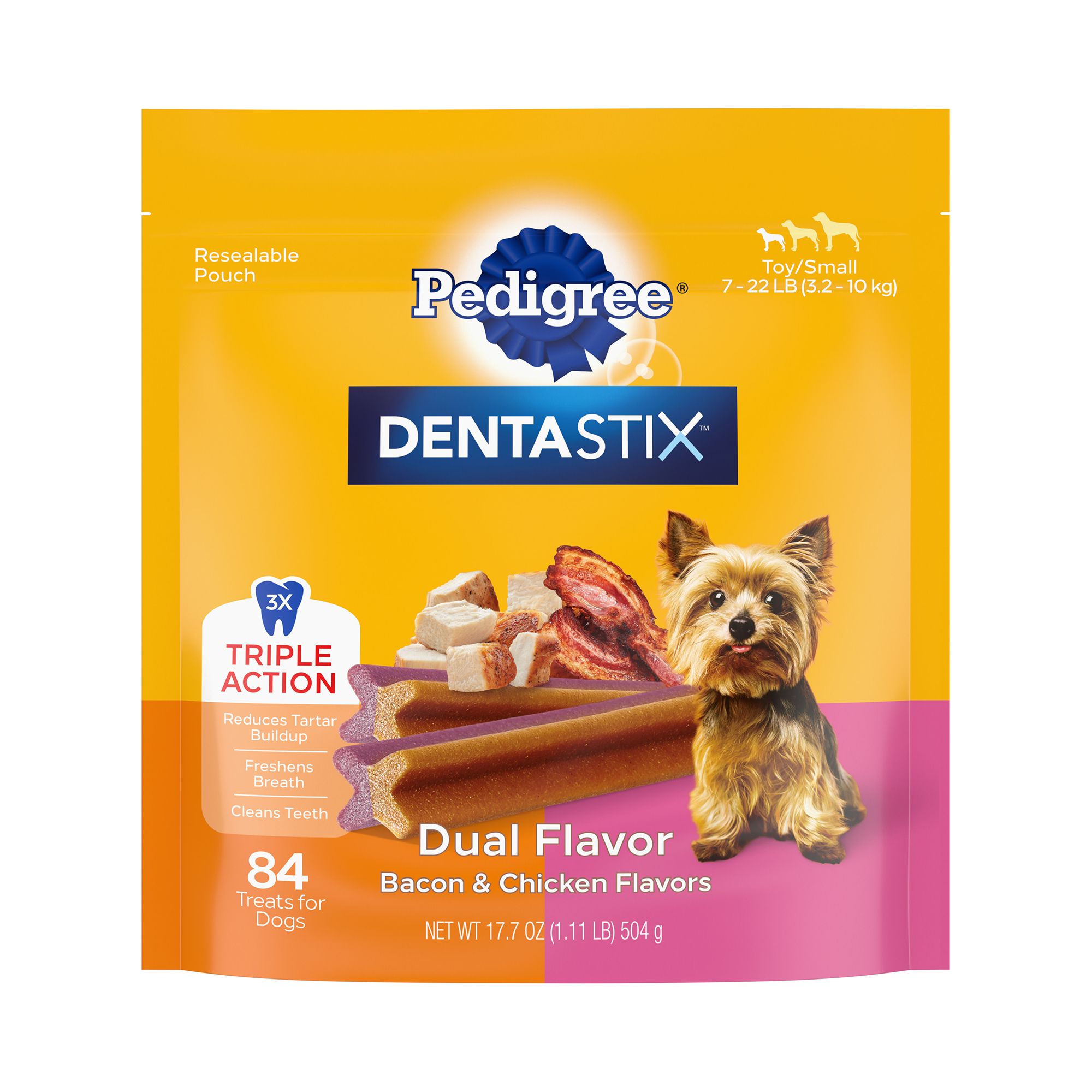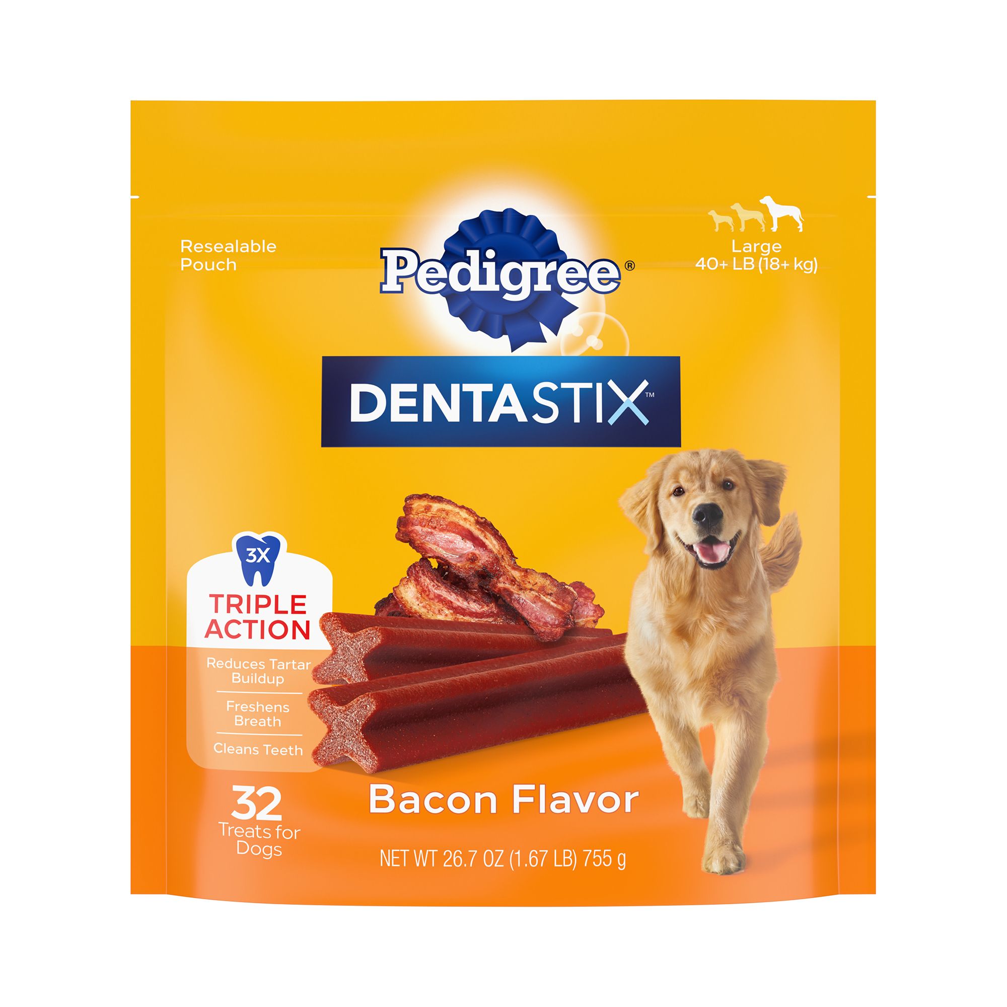 Nutritional Benefits: 1.47 lb. Bag: Contains one (1) 1.47 lb. bag of Pedigree Dentastix Dual Flavor Large Breed Dog Treats, Bacon & Chicken.
