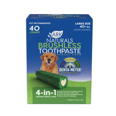 Keeping your pup healthy from tooth to tail is easy with Ark Naturals Brushless Toothpaste dental chews. Say goodbye to bad dog breath and hello to clean teeth with our tried and true formula that uses real dental ingredients. Every time your pup chews he does the cleaning for you; the unique texture reduces plaque and tartar and the ridges help clean along the gumline. Enjoy the only 4-in-1 dental chew with a chewy toothpaste center that polishes, just like your own toothpaste. Daily chewing and aromatic spices freshen breath and are recommended up to twice a day!