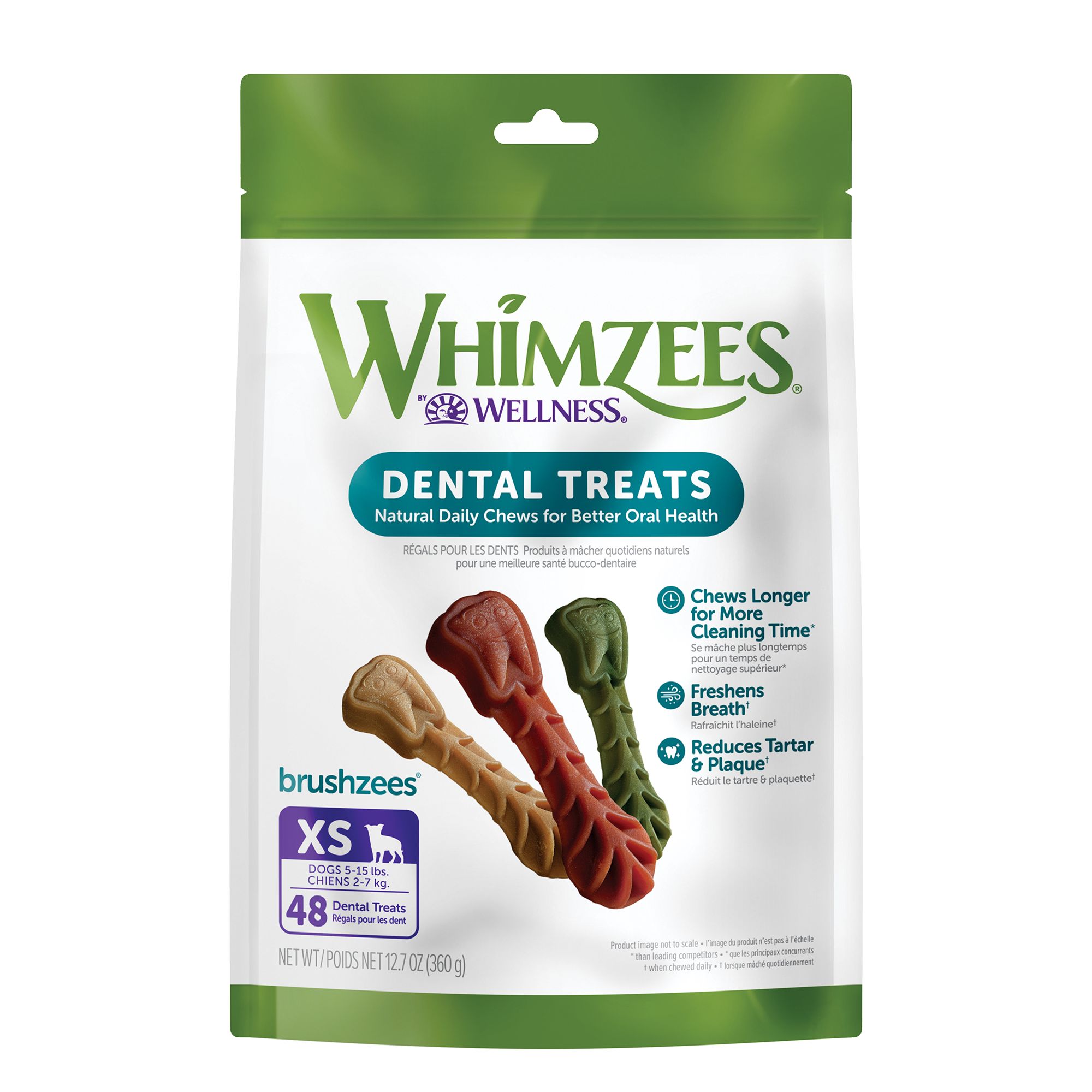 NATURAL DENTAL TREATS: Scientifically crafted to support the 4 areas vets check most*: Breath, Tartar, Plaque, Gums.*when chewed daily for dogs 25 to 40 poundsALL NATURAL INGREDIENTS: Our chews are made with 6 primary ingredients and no artificial colors, flavors, preservatives, or grain. They're perfect for dogs with food allergies or sensitivities.DAILY DENTAL TREAT: Feed 1 Whimzees Brushzees dental chew to your adult dog every day for the most convenient, effective, and playful way to clean their teeth. Regular use keeps your dog's mouth fresh.REDUCES PLAQUE & TARTAR AND FRESHENS BREATH: Through mechanical chewing actionSpecies: Dog