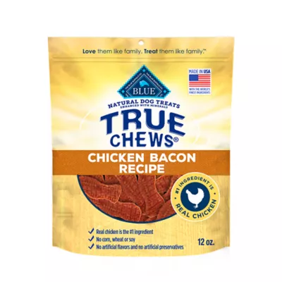 DESCRIPTION Give your dog the taste of real chicken with BLUE True Chews Chicken Bacon Recipe Natural Dog Treats. Made with real USA chicken as the first ingredient, these tender dog treats are easy to tear into smaller pieces, so they're great for dogs of all breed sizes and ages. And like all Blue Buffalo dog treats, these treats for dogs never contain chicken (or poultry) by-product meals, corn, wheat, soy, artificial flavors, or preservatives. Watch their tail wag when you reward them with BLUE True Chews Dog Treats.
