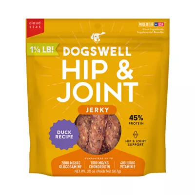 HIGH PROTEIN JERKY – This functional jerky is made with high–quality protein from duck. Coming in at 45% protein, these jerky treats help to support lean muscle mass and provide energy.CLEAN INGREDIENTS, SUPPLEMENTAL BENEFITS – With no grains, no artificial colors or flavors, no corn, wheat, or soy, and no added gluten, molasses or corn syrup, you can both feel good and do good when treating your dog.LIVE LIFE WITH YOUR DOG BY YOUR SIDE – Dogswell is a proud member of the Cloud Star Family. Our love for dogs built a family.Brand: Dogswell Hip & Joint Jerky