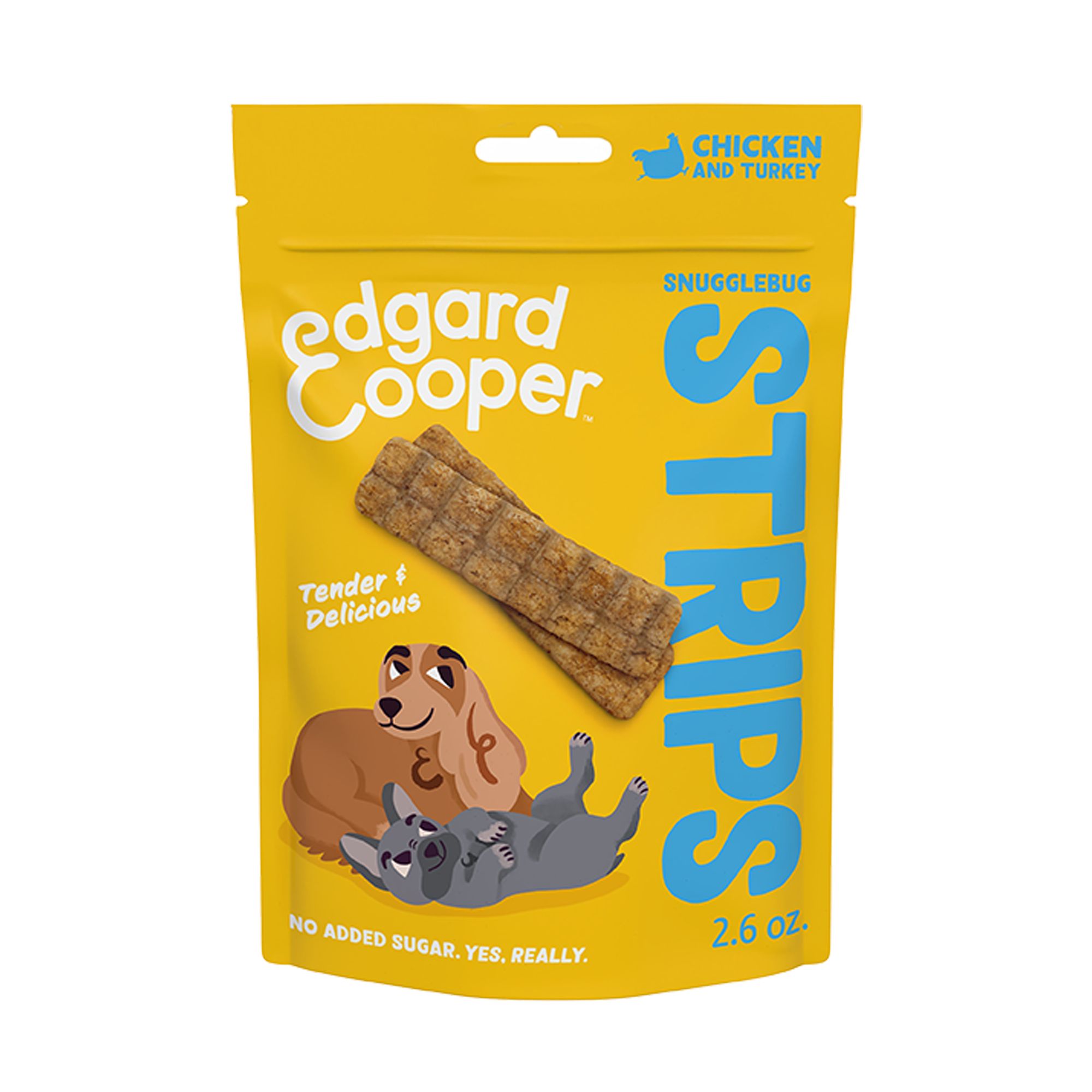 - and they're grain-free, so they're easy to digest. This tasty, wholesome recipe has no added sugar, so you can feel extra good about feeding them. Your pup will be pleased, and we have the tail-wagging testimony to prove it: Edgard & Cooper is loved by over 1 million pets across Europe. Try Snugglebug Strips and earn your own woofs of approval.