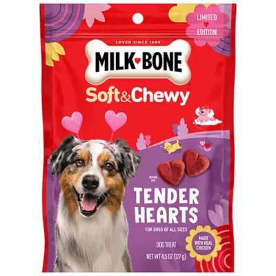 Features & Benefits: CONTAINS: One 4.5–oz. bag of Milk–Bone Soft & Chewy dog treats LIMITED EDITION: Heart–shaped Valentine's Day dog treats with a festive red color DELICIOUSLY TENDER: Soft dog treats made with real chicken FOR DOGS OF ALL SIZES: Small dog snacks that are easy to break into smaller pieces BAKED WITH LOVE: In Buffalo, NY, USA