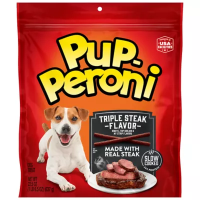 Contains one (1) 22.5 oz. bag of Pup-Peroni Triple Steak Flavor soft dog treats made with real steak. Slow cooked for a tender texture and rich, meaty taste your dog will love. Ribeye, top sirloin and New York strip flavors. Real beef is the number 1 ingredient. Produced in USA facilities with no Red 40 and no fillers.