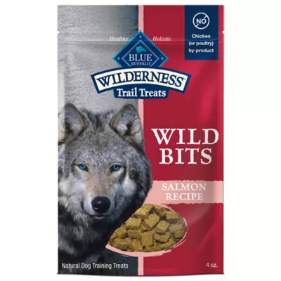 DESCRIPTION BLUE Wilderness Wild Bits are soft, hearty dog-training treats that are perfect for small, medium and large dogs of all life stages - from puppies to senior dogs. They're packed with more of the fish he craves. With protein-rich, real salmon as the primary ingredient and a natural, healthy recipe that's free of grains, chicken (or poultry) by-product meals, corn, wheat, soy, artificial flavors and preservatives, they're the perfect way to reward your best pal.