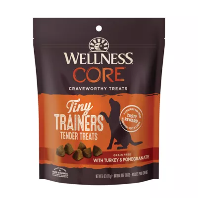 DESCRIPTION Wellness CORE Tiny Trainers Tender Treats are wholesome, all natural, tender, tasty, bite-sized dog treats made in Canada and crafted from the finest globally-sourced ingredients. Wellness Natural Pet Food offers a variety of products for your pets needs including dry dog food, wet dog food, dog food toppers, dog treats, dental chews, dry cat food, wet cat food, and cat treats.