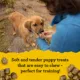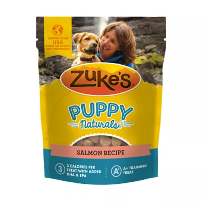 Key Benefits: Zuke's Puppy Naturals With Added Vitamins And Minerals Training Treats, Salmon Recipe. Natural Soft Puppy Treats For Training, Real salmon is the first ingredient in these tender puppy training treats. These fish treats bites are crafted in the USA with the Earth's ingredients, like salmon and cherries, This premium bag of treats with salmon is formulated with added DHA and EPA, which help to support brain development in the early stages of a dog's life, With only 2-3 calories each in these purposefully small training treat bites for dogs, Zuke's Puppy Naturals make great soft dog snacks for guilt-free treating, Zuke's natural dog treats for puppies with added vitamins and minerals and no artificial colors, flavors, or preservatives, come in a resealable dog treat pouch for training or rewards on-the-go