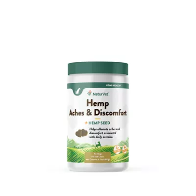 Description and Overview: NaturVet Soreness Relief with Hemp Soft Chews bring targeted comfort support for dogs who need help easing stiffness from play, exercise, or age. Each vet–formulated chew delivers Glucosamine for cartilage, Omega fatty acids from Hemp and Flaxseed for mobility, Yucca and White Willow Bark for natural soothing support, plus L–Tryptophan to promote relaxation. Perfect for active pups, large breeds, or seniors who still love to move, these chews help your dog stay more comfortable day to day. With a chewy texture and irresistible bacon and chicken flavor, Soreness Relief with Hemp makes comfort care simple and tail–waggingly tasty. NaturVet is a 30–year pioneer and present–day innovator manufacturing high–quality pet products designed to support the health, wellness, and quality of life for pets and pet parents. Whether it's a pet vitamin, allergy supplements for dogs and cats, pet joint support, or digestive aids, all of our pet health and wellness products are formulated by veterinarians and manufactured in–house to ensure quality.