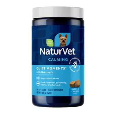 Description and Overview: NaturVet Quiet Moments Calming Supplements are formulated to help reduce stress and tension in dogs. These bacon and chicken flavored soft chews can help your pet relax during storms, fireworks, travel, grooming, a trip to the vet, and more. Formulated by trusted vets, our formula features a calming blend of Melatonin, Chamomile, Ginger, L–Tryptophan, and Thiamine to help soothe your dog's nerves. Give 1 soft chew to dogs up to 26 lbs, 2 chews for 27 – 50 lbs, 4 chews for 51 – 99 lbs, and 6 chews for dogs 100 lbs and over 30 minutes before a stressful situation. Our dog supplements come in a resealable cup to help maintain freshness and flavor. NaturVet is a 30–year pioneer and present–day innovator manufacturing high–quality pet products designed to support the health, wellness, and quality of life for pets and pet parents. Whether it's a pet vitamin, allergy supplements for dogs and cats, pet joint support, or digestive aids, all of our pet health and wellness products are formulated by veterinarians and manufactured in–house to ensure quality.