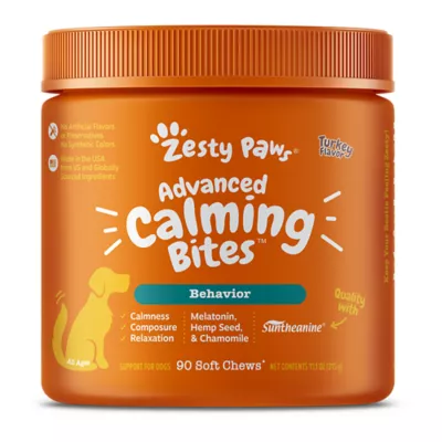 Zesty Paws Calming Bites Supplement for Dogs are great for helping dogs feel calm, comfortable, and stress-free. That's why each chew includes Suntheanine, a 100%-pure and non-GMO form of L-Theanine that promotes calmness and composure. This formula also contains Organic Chamomile, Valerian Root, Hemp Seed Powder, Thiamine, and L-Tryptophan to help dogs with normal stress.