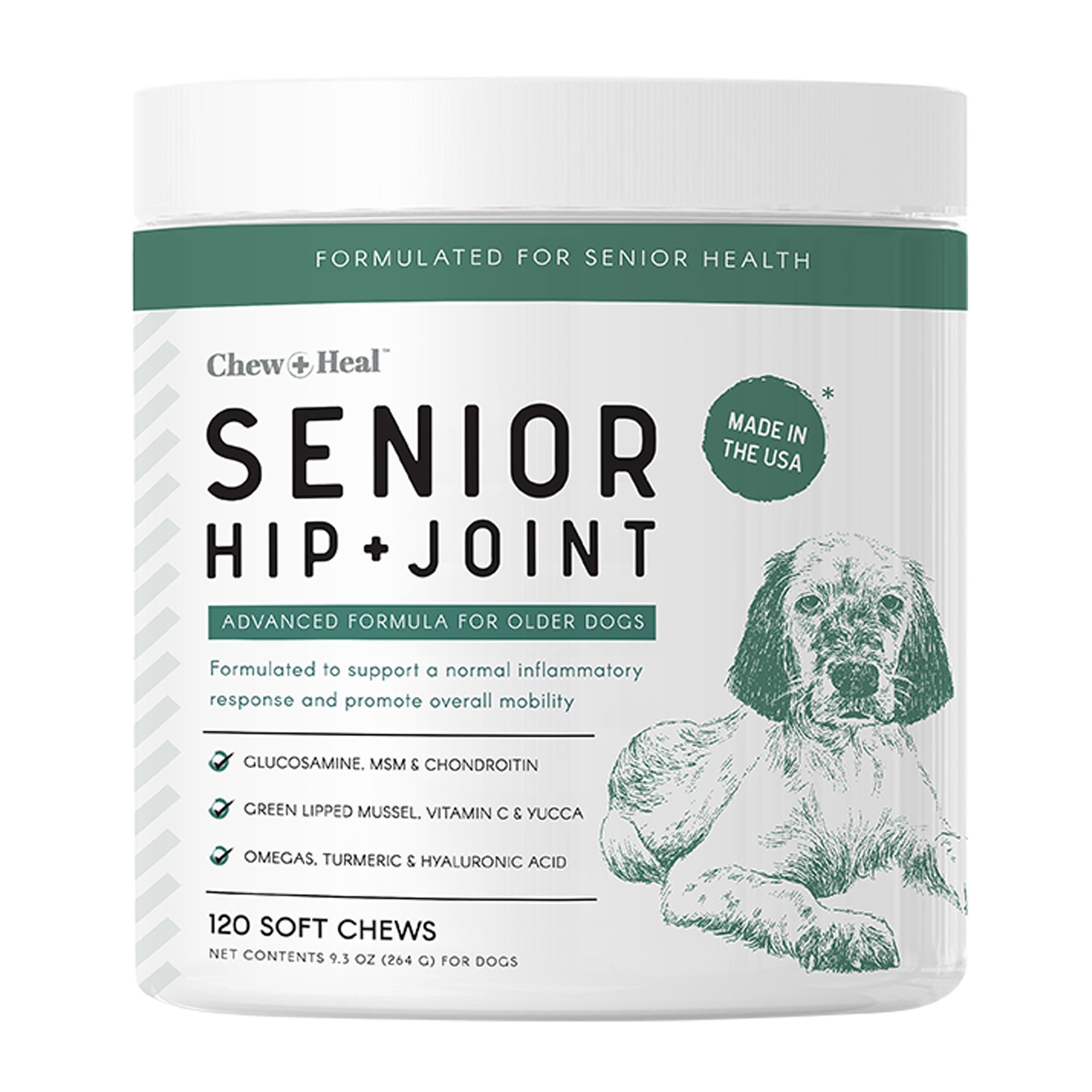 Chew + Heal Senior Hip + Joint Supplement, Peanut Butter Flavor Soft Chews are designed to provide your elderly dog with the vitamins and minerals needed to support joint and cartilage health and increase overall mobility. Made with a yummy peanut butter flavor, these treat-like soft chews contain glucosamine, MSM and chondroitin to help promote a normal inflammatory response, improve mobility and increase joint lubrication. Formulated with 8 active ingredients, including omega-3 and 6 fatty acids to help reduce hip and joint discomfort, while promoting overall health. Chew + Heal is all about providing the best for your pup based on their unique needs. We recognize the level of care and attention that every dog needs, and our catalog is carefully curated to provide effective, useful, and tasty products that will improve your dog's quality of life. Our products are all made in the USA in cGMP & FDA-audited facilities, and our top goal is your fur baby's health and happiness. Whether it's supplements, first aid products or functional treats, you can trust our team to produce products of the highest quality and provide unparalleled customer care. The older we get, the more tender loving care our hips and joints may need. The same is true for your dog, which is why Chew and Heal Peanut Butter Senior Hip & Joint Dog Supplement is chock full of the vitamins and minerals your senior dog needs to remain fit as a fiddle. Formulated with glucosamine, MSM, and chondroitin to help reduce pain and inflammation, and increase mobility and joint lubrication Chew and Heal Senior Hip & Joint Dog Supplement is a tasty chew that works to keep your older dog feel young at heart.