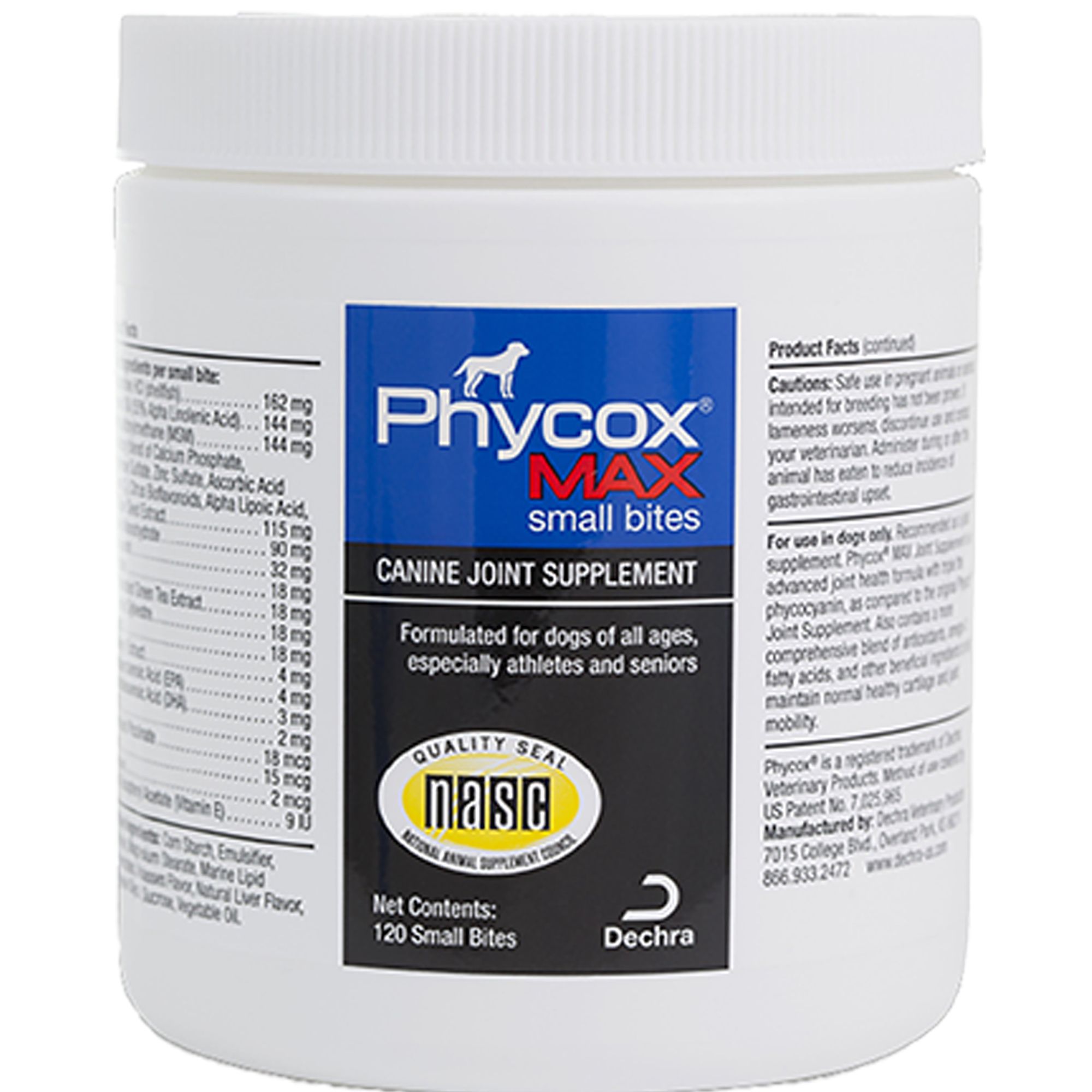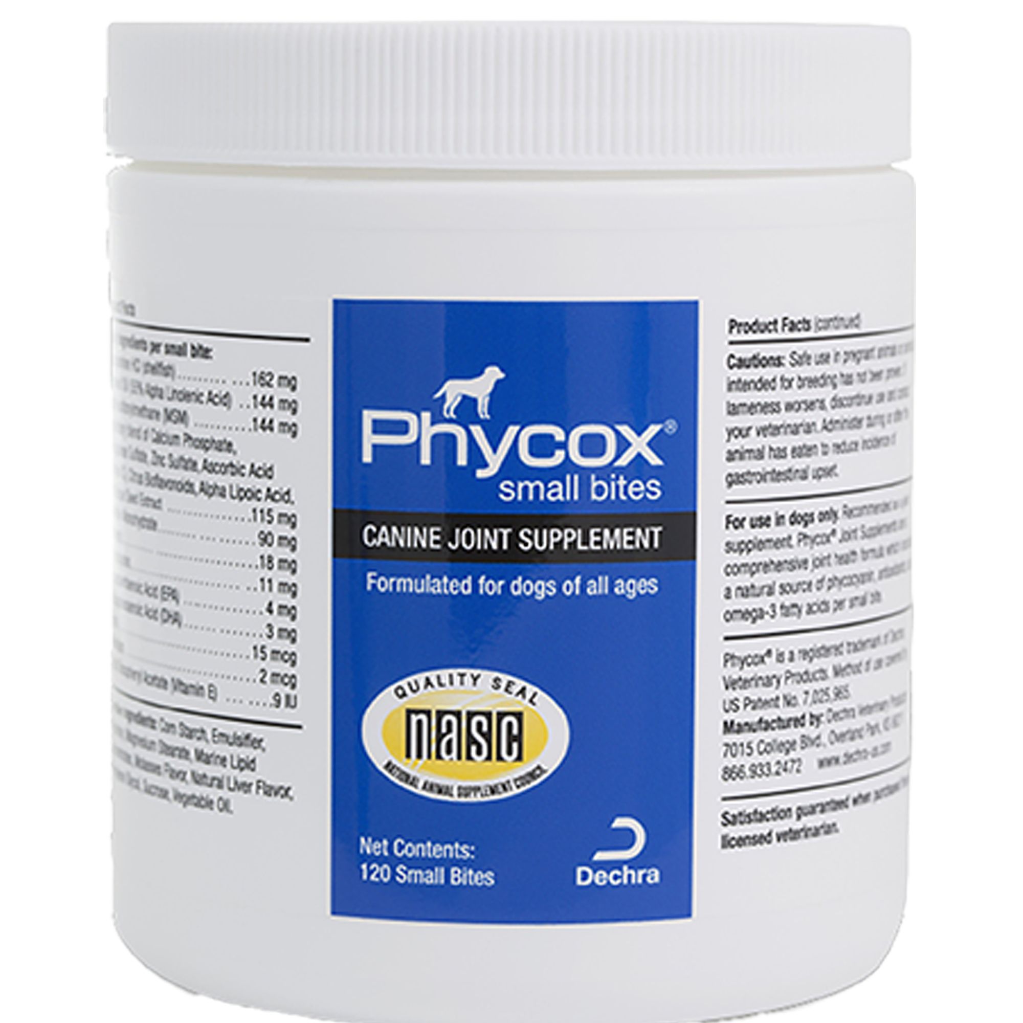 Description and Overview: Phycox Canine Joint Support Phycox Soft Chews were developed for canine joint support. These chews are soft and tasty, made of Phycocyanin derived from blue–green algae, clinically proven to inhibit COX–2, an enzyme that causes inflammation. Treat and prevent your dog's day–to–day joint discomfort with a daily dosage of this joint supplement. Available in 60 and 120–count.