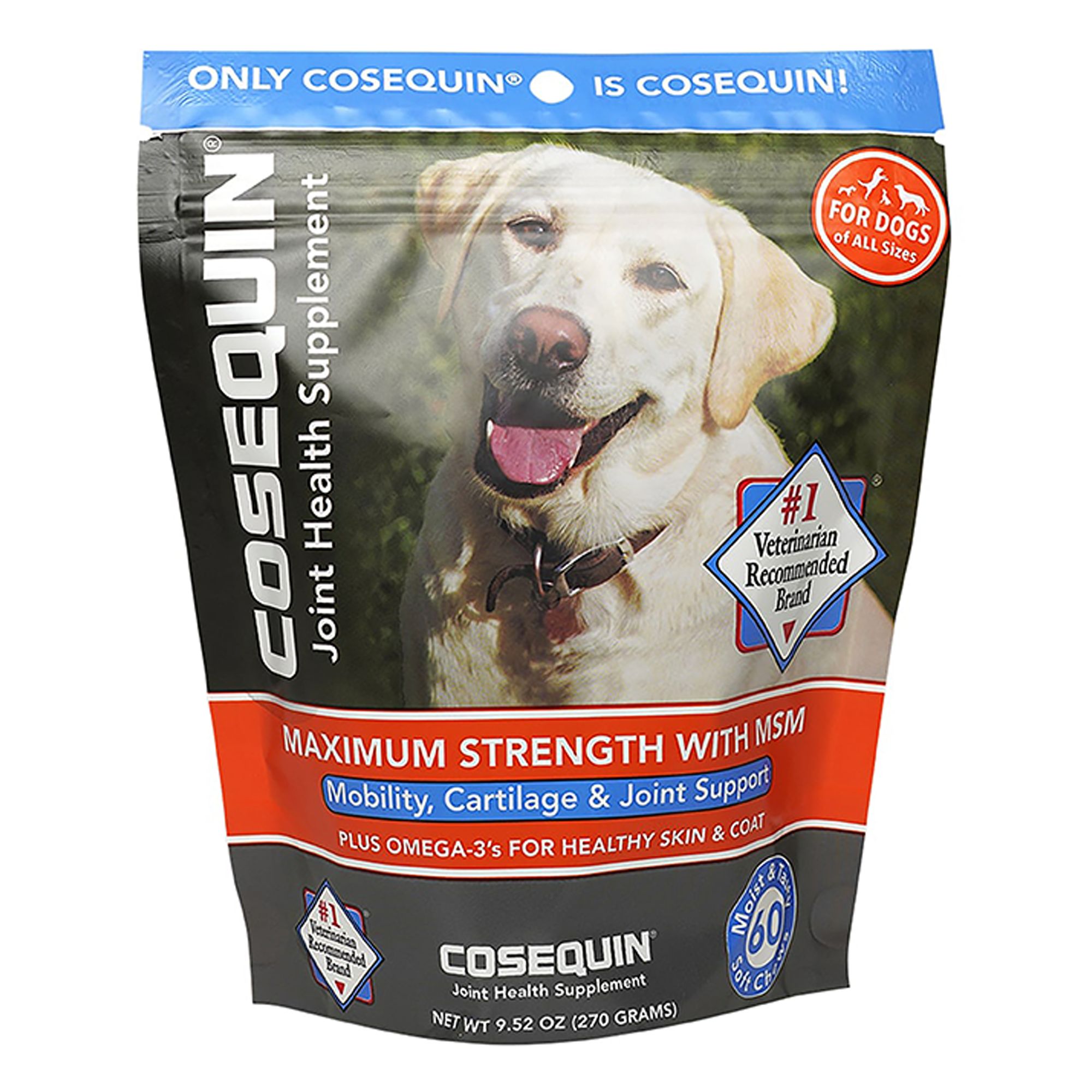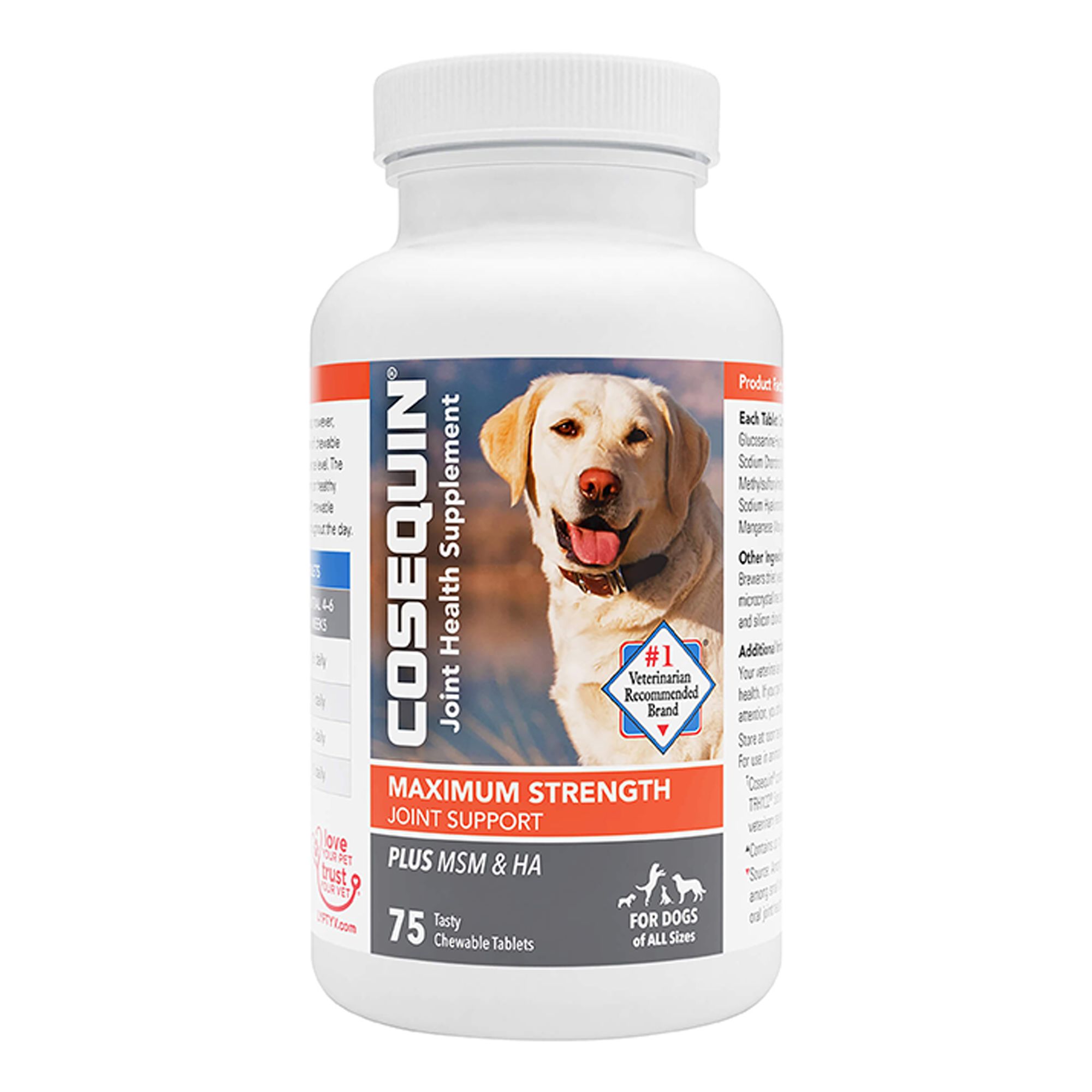 Description and Overview: Cosequin Maximum Strength Plus MSM contains glucosamine hydrochloride, sodium chondroitin sulfate, and methylsulfonylmethane (MSM). This combination of ingredients help support healthy cartilage. Cosequin joint health supplements are brought to you by Nutramax Laboratories Veterinary Sciences, the #1 veterinarian recommended supplement company. Source: Among retail brands. Survey conducted among small animal veterinarians who recommended oral joint health supplements. *Source: Survey conducted among small animal veterinarians who recommended animal supplements.
