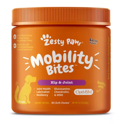 Don't let your dog's frisbee collect dust! Zesty Paws' delicious Mobility Bites are soft chews that provide hip and joint support to keep your furry friend jumping for joy. They're great for adult and even senior furry pals of small, medium, and large sizes. This functional chewable dog supplement features OptiMSM, a premium form of MSM that provides normal muscle support, plus Glucosamine HCl and Chondroitin Sulfate to support hips, joints, connective tissue, and cartilage for dogs. Best of all, pets love the delicious taste thatâll make your furry friend go wild for more. Also, pet moms and dads can let out a sigh of relief knowing that while their pups are feeling spoiled with special treatment, they'll also be getting the premium support they need for hip and joint function.
