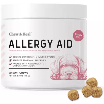 Chew + Heal Allergy Aid Supplement Soft Chews are formulated to be an immune system booster. These delicious soft chews are loaded with ingredients like quercetin, fish oil, turmeric, grape seed extract and pumpkin powder to help provide immune and respiratory support. Made with a yummy chicken flavor, these omega-loaded, treat-like soft chews feature natural ingredients like turmeric and fish oil boost your furry friend's immune system and respiratory system. Consistent use promotes a softer, shinier coat, reduces skin blemishes and promotes skin and coat health. Chew + Heal is all about providing the best for your pup based on their unique needs. We recognize the level of care and attention that every dog needs, and our catalog is carefully curated to provide effective, useful, and tasty products that will improve your dog's quality of life. Our products are all made in the USA in cGMP & FDA-audited facilities, and our top goal is your fur baby's health and happiness. Whether it's supplements, first aid products or functional treats, you can trust our team to produce products of the highest quality and provide unparalleled customer care. 5 - Chew + Heal Allergy Aid Dog Supplement is formulated to help relieve your canine companion's seasonal allergies and itchy skin. It's formulated with fatty acids and oils to help promote skin health and remove skin blemishes. It contains omega fatty acids, EPA and DHA, to help with skin allergies and arthritis, too!