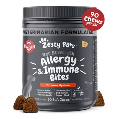 Zesty Paws Aller-Immune Bites Dog Vitamins are vet-formulated soft chews made with a high concentration of ingredients that help support your pet's immune system and more! These soft chews feature three clinically studied branded ingredients, which are EpiCor, DE111 (Bacillus subtilis), and AlaskOmega Fish Oil. Plus, these supplements also include antioxidants from Spirulina, a stunning 500 mg (per chew) of Colostrum, and a Proprietary Immune Support Blend with Astragalus Root, Quercetin Dihydrate, Vitamin C (Ascorbic Acid), L-Arginine, and Bromelain. Together, this paw-erful collection of ingredients support immune function, seasonal allergies, normal respiratory function, digestion, skin health, and pathogen resistance to help the body's immune response eliminate those yucky microorganisms! And since these bites have a wag-worthy smoked cheese flavor, your furry friend will love eating them. Say goodbye to bulky pills and tablets and hello to these whisker-licking soft chew dog vitamins. With Vet Strength Aller-Immune Bites, you can enjoy even more fun and fond memories that your pup's itching to give.