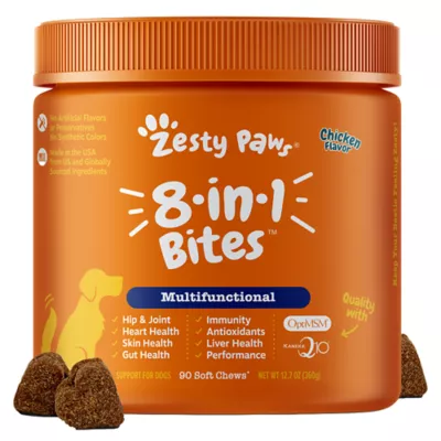 DESCRIPTION Each day, your dog provides you with a daily dose of fun, laughs, love, and affection. Now, you can reward your canine's loving companionship with Zesty Paws Multivitamin Bites. These soft chews feature premium ingredients that provide paw-erful support to help dogs live happily.
