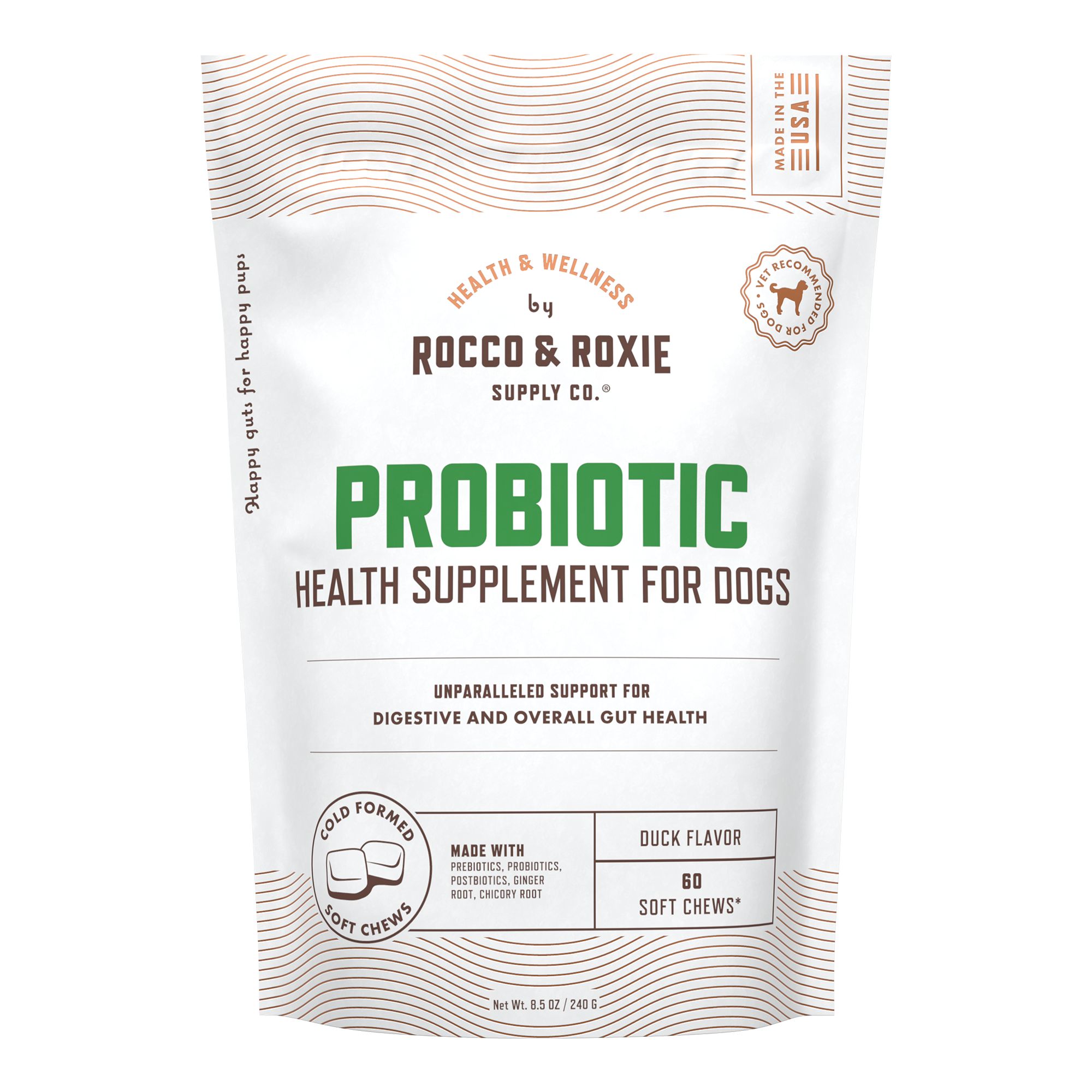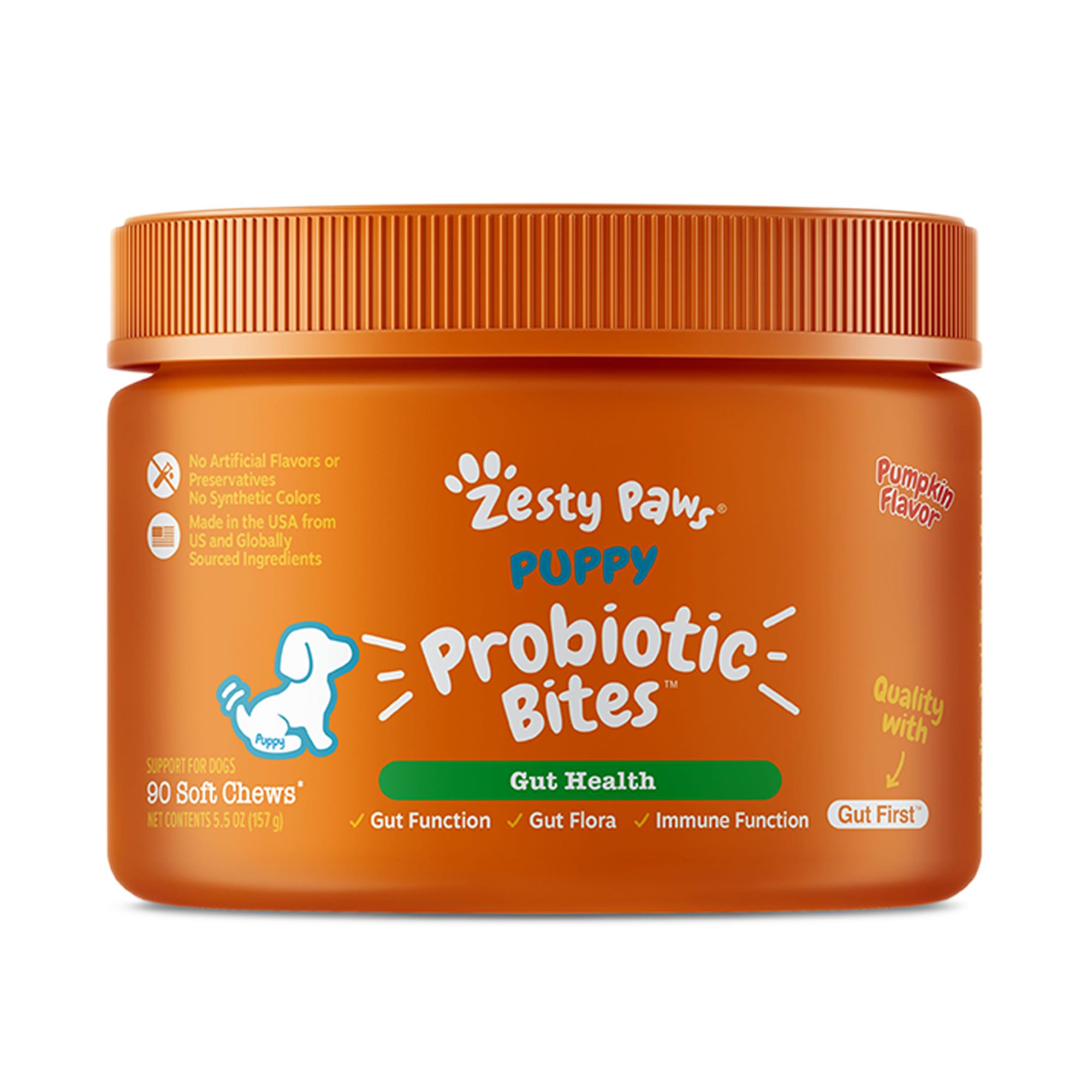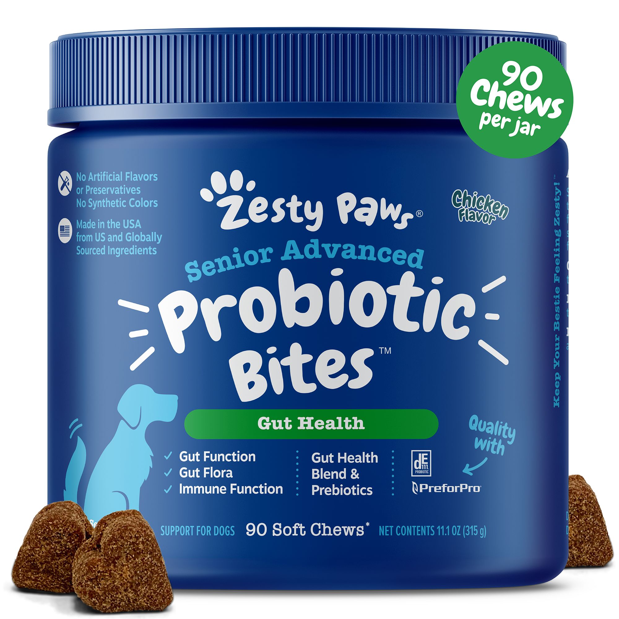 As a pet parent, you're rightfully sensitive about every area of your dog's Zesty life -especially with how you carefortheir tummy! So, it's only natural that you want to aid your dog's digestive health in the yummiest way possible; especially since pets also have that allergy to yucky flavors from most products. Now, you can let out a sigh of pure relief and rest easy with a veterinarian formulated dog supplement. Vet Strength Pre, Post & Probiotic Bites are the most advanced formula in our gut health dietary supplements. With a delicious Fido-approved flavor, these veterinarian-formulated chews provide full digestive and gut support. These soft chews have two premium proprietary blends that include VitaFiber, LBiome, Gingever, and DE111. Together, these blends of probiotics, enzymes, and branded ingredients help support digestion, immunity, bowel function, and normal gut microflora.