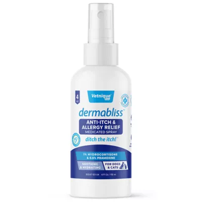 Dermabliss Anti-Itch & Allergy Relief Medicated Spray was designed by veterinarians to relieve itching and irritation with our soothing oatmeal formula. Dermabliss Spray is a fragrance-free, topical itch-relief spray containing Hydrocortisone, Pramoxine, and soothing Oat Extract. Our soothing and moisturizing medicated formula promotes healthy skin and provides much-needed relief from itchy skin for cats and dogs!