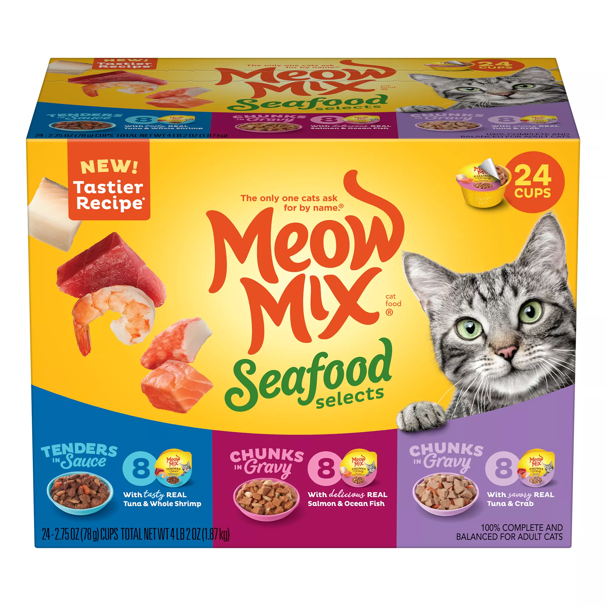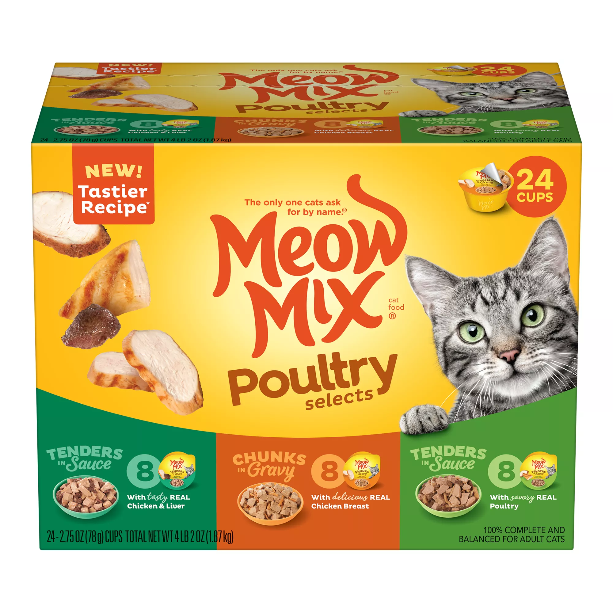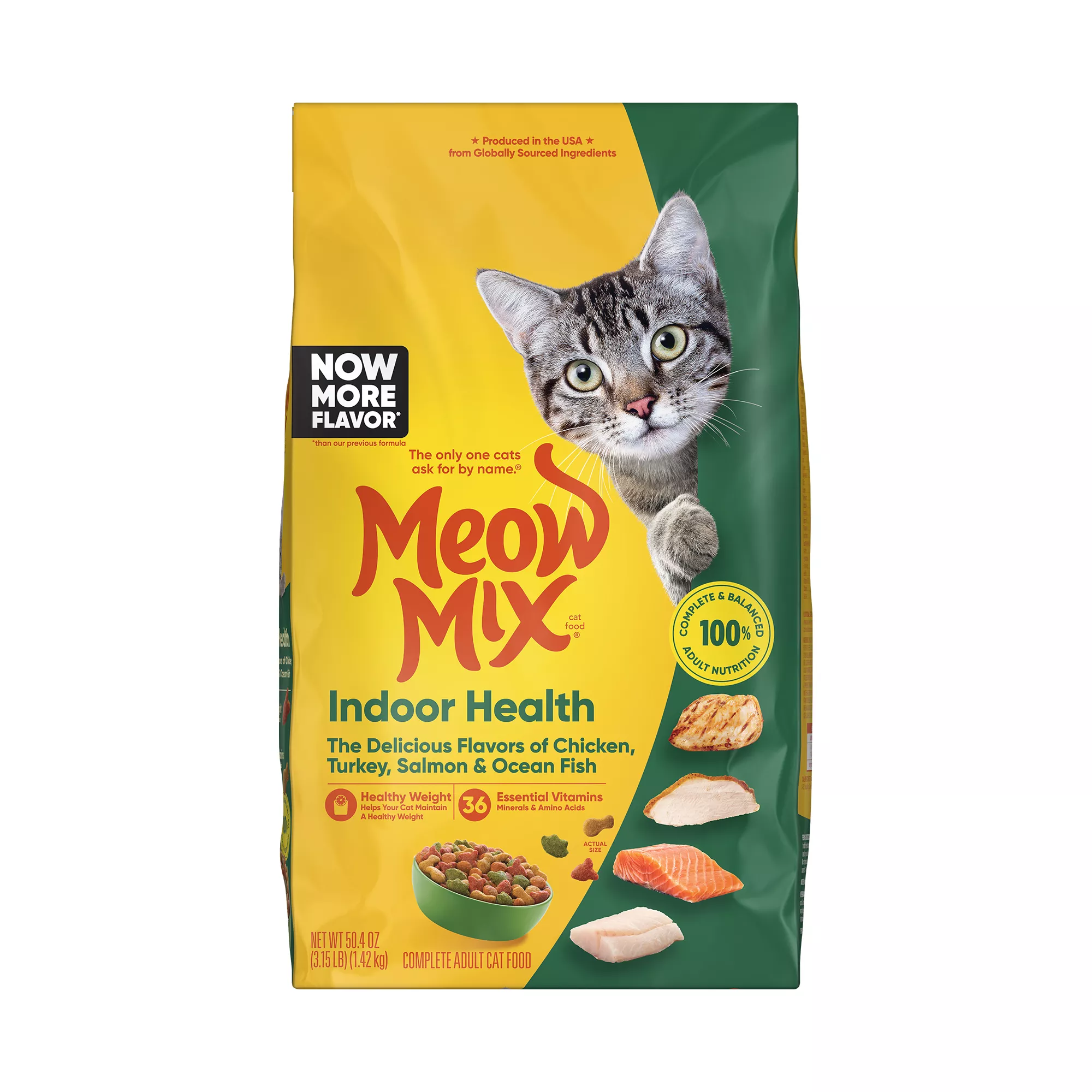 The flavor cats love – and the nutrition they need – that's what Meow Mix cat food delivers. Designed with them in mind, Meow Mix offers complete and balanced nutrition for cats at every age and stage of life – and it comes in a variety of flavors, so even if you have a finicky eater, it's easy to find a cat food formula they'll love. Available in bags and cans, Meow Mix offers something for every cat. Meow Mix Original gives them a medley of flavors, including chicken, turkey, salmon and ocean fish, and a signature crunch, while Meow Mix Dry Cat Food with Tender Centers for adults gives your cat two textures in one bag. Meanwhile, Meow Mix kitten food is specially formulated to help your youngest grow healthy and strong – and Meow Mix single serving cans come in a variety of flavors to keep cats satisfied. Regardless of which type of food your cat loves or which formula you choose, Meow Mix can help your cat get the nutrients they need have a long, happy and healthy life. Explore our complete collection to find the right cat food option for your feline friend.