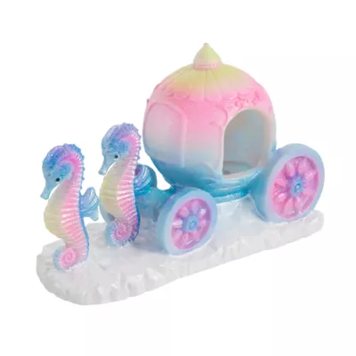 This Top Fin Seahorse & Carriage Aquarium Ornament brings a fun and colorful look to your aquarium's decor. This piece features seahorses and a beautiful carriage, and comes with a solid base that keeps it in place once set down in your aquarium. What a great addition this piece makes to your underwater world. Only at PetSmart.