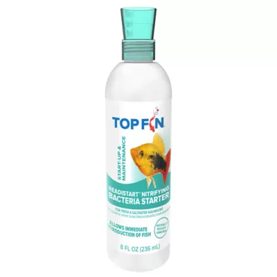 Improve the water in your aquarium with Top Fin Readistart Nitrifying bacteria Starter. Perfect for start-up and maintenance, this product allows for the immediate introduction of fish and naturally reduces ammonia. Use when setting up a new aquarium, performing a water change, adding new fish, changing filter media, after medicating, or when ammonia or nitrites are detected. Only at PetSmart.