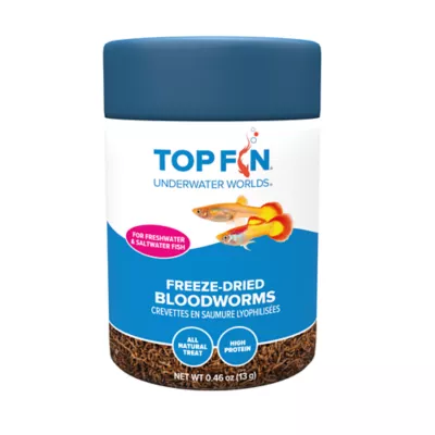 Top Fin Freeze-Dried Bloodworms are a nutritious treat for betta, tropical and marine fish. These freeze-dried treats are processed to minimize contaminants that may be present in live bloodworms. In addition, offer your fish a daily diet of Top Fin Flakes or Pellets. Only at PetSmart.
