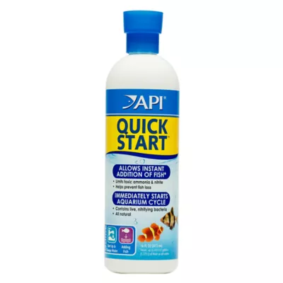 API Quick Start freshwater and Saltwater Aquarium Nitrifying Bacteria in a 16-oz bottle is perfect for use when starting a new aquarium. This product reduces harmful compounds, preventing fish loss.