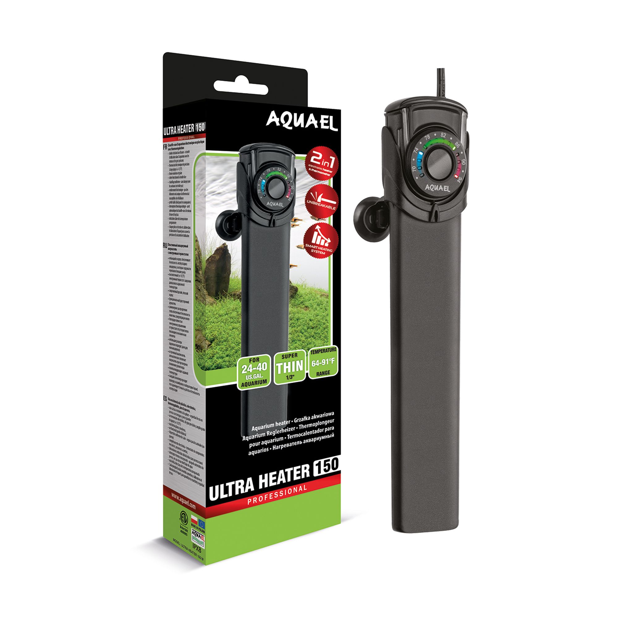 Tetra's 150 Watt Submersible Heater is designed for 30 to 40 gallon Aquariums. UL listed. Electronic thermostat automatically maintains water temperature. Prevents overheating, extending heater life. No adjustments necessary. The indicator light lets you know when the water is being heated (red light) and when it is at the proper temperature (green light). Silicon Carbide crystals improve heat distribution and transfer. Strong glass tube is heat and shock resistant.