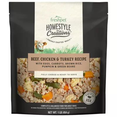 Freshpet Homestyle Creations Beef, Chicken & Turkey with Brown Rice & Veggies Fresh Dog Food is a freshly-crafted meal of real ground beef, chicken and turkey, blended with a vitamin-rich assortment of vegetables.