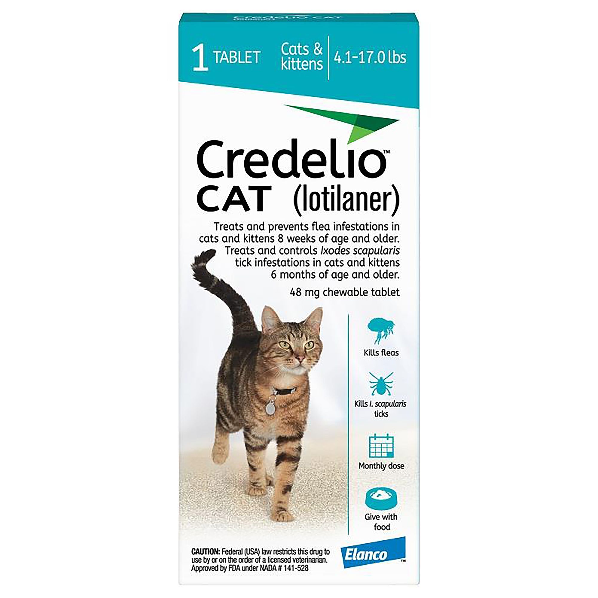 - Credelio CAT (lotilaner) is the first flea and tick chewable tablet for cats, administered once per month to kill adult fleas and is indicated for the treatment and prevention of flea infestations (Ctenocephalides felis) in cats and kittens 8 weeks of age and older, and weighing 2 pounds or greater. CREDELIO CAT is also indicated for the treatment and control ofIxodes scapularis(black-legged tick) infestations for one month in cats and kittens 6 months of age and older, and weighing 2 pounds or greater.