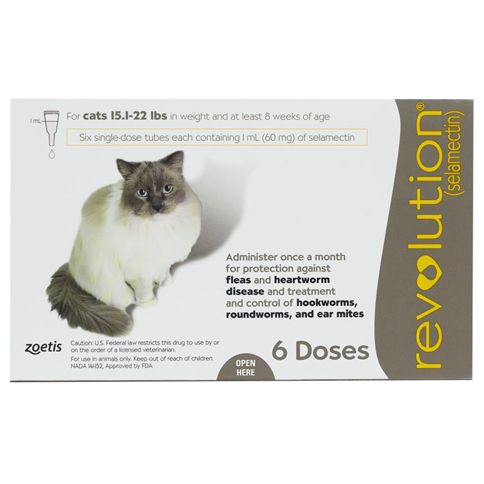 Description: Revolution Plus Topical Solution for Cats prevents heartworm disease; treats and controls roundworm and intestinal hookworm infections; treats and controls ear mite infestations; treats and prevents flea infestations (kills adult fleas); prevents tapeworm infections as a direct result of killing vector fleas on the treated cat; and treats and controls tick infestations with lone star ticks, Gulf Coast ticks, American dog ticks, and black–legged ticks for one month in cats and kittens 8 weeks and older, and weighing 2.8 pounds or greater.Please note: Due to a manufacturer redesign, the same trusted formulation is receiving new, easier–to–read packaging. Your medication may arrive with this updated packaging, depending on manufacturer availability.Protection Indoor & Outdoor Cats Need: Revolution Plus in a monthly topical that protects your cat against fleas, ticks, ear mites, roundworms, hookworms, and heartworm disease. Approvedfor cats and kittens eight weeks and older, weighing 2.8 lbs or more. Itâs available with a prescription from your veterinarian.Vets #1 Choice for Cats1: Revolution Plus is the most prescribed medicine for feline parasite protection with over 20 years of proven protection*.Once–a–Month Treatment: One application a month can help protect your cat from the most common parasites.All–in–One Solution: Parasites are not ââ¬Åoutdoor–only.ââ¬Â Any cat or kitten can regularly come in contact with harmful pests. Regardless of your catâs lifestyle (indoor only, indoor⁄outdoor, outdoor only), Revolution Plus protects your cat from parasites that follow you home.Easy–to–Apply: Applying Revolution Plus doesnât require gloves. It's quick–drying, small–volume, and applied topically on the back of your catâs neck.Revolution Plus (selamectin and sarolaner topical solution) is a simple–to–apply, quick–drying, small–volume, monthly topical solution that protects your cat against most common feline parasites: fleas, ticks, ear mites, roundworms, hookworms, and heartworm disease. It eliminates the need for multiple treatments, simplifying your cat's parasite control routine. Whether your cat lives an indoor, outdoor, or hybrid lifestyle, they are vulnerable to parasites and would benefit from Revolution Plus. When you choose Revolution Plus, youâre choosing veterinarianâs #1 choice for cats1with 20 years of proven protection.* Studies show Revolution Plus kills 4 types of ticks for a full month after one dose, including Lone Star ticks, black–legged ticks (a.k.a. deer ticks) American dog ticks and Gulf Coast ticks.2,3Effective results sustained for up to 5 weeks for black–legged or deer tick and American dog tick.2,4Revolution Plus kills fleas before they lay eggs and keeps killing for a full five weeks.5Studies to support FDA approval showed that one dose of Revolution Plus was 100% effective in preventing heartworm disease. It started killing fleas within 6 hours of re–infestations5and killed over 99% of ear mites for a full month, reduced nearly 100% of roundworm and hookworm eggs after a single dose.5Revolution Plus is available by veterinarian prescription only. Ask your vet if Revolution Plus is right for your cat or kitten. Automatic deliveries provide savings, convenience, and the peace of mind that your cat never misses and a dose. Revolution Plus is also eligible for Zoetis Petcare Rewards Program. Enroll today for free to earn points on every dollar spent on eligible purchases that can be redeemed for services at your vet.*Revolution Plus is veterinariansâ #1 trusted choice in feline parasite protection, built upon the proven 20–year legacy protection of Revolution (selamectin).References:1. Vetstreet FTH Projection February 2021. Canine and Feline Flea, Tick, Heartworm Market Share. February 2021. Data on file. Zoetis Inc.2. Zoetis Data on File, Study Report A186C–US–14–100, 2014.3. Zoetis Data on File, Study Report A186C–US–14–106, 2014.4. Zoetis Data on File, Study Report A186C–US–14–098, 2014.5. Revolution Plus (selamectin and sarolaner topical solution). Package insert. Zoetis Inc; 2018.6. Zoetis Data on File, Study Report A181C–US–15–166, 2017.Product sourced directly from the manufacturer or their approved distributor. Guaranteed genuine product backed by the manufacturer.For: Cats (8 weeks of age and older)