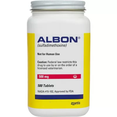 Product Description & Form: Albon® 125 mg Tablets: 8 mm, white, round (biconvex) tablet, scored in half, imprinted with ALBON;125. (NDC 54771–8431–01) Albon® 125 mg Tablets Albon® 250 mg Tablets: 10 mm, white, round (flat faced) tablet, scored in half, imprinted with ALBON;250. (NDC 54771–8432–01) Albon® 250 mg Tablets Albon® 500 mg Tablets:Â 13 mm,white, round (flat faced) tablet, scored in half, imprinted with ALBON;500. (NDC 54771–8433–02) Albon® 500 mg Tablets