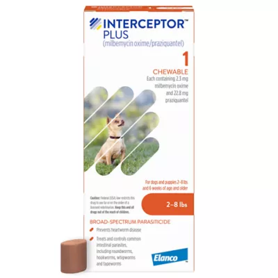 Description: Interceptor Plus (milbemycin oxime⁄praziquantel) for Dogs is a monthly chewable tablet indicated for the prevention of heartworm disease and for the treatment and control of common intestinal parasites, including adult roundworm, hookworm, whipworm, and tapeworm infections.Interceptor PLUS protects against more types of worms than other formulasTasty, monthly chewable is flavored with real chicken, making dosing easyPrevents heartworm disease plus treats and controls adult hookworm, roundworm, whipworm and tapeworm infectionsCovers worms commonly found in dog parks trails, backyards or carried by mosquitoesDelivers 30 days of protectionIf your dog is only protected from heartworm disease, there's a gap in their coverage. Close the gap with Interceptor Plus. Interceptor Plus also treats and controls four other major worms including adult roundworm, hookworm, whipworm and tapeworm infections in dogs and puppies. That's protection against more types of worms than Heartgard Plus. Unlike Interceptor Plus, both Heartgard Plus (ivermectin⁄pyrantel) and Simparica Trio (sarolaner, moxidectin, and pyrantel chewable tablets) do not cover tapeworm or whipworm.*When untreated, intestinal worms can cause discomfort and fatigue with diarrhea, weight loss, anemia and more. That's why Interceptor Plus makes dosing easy and convenient with 5–in–1 protection in a tasty, chicken–flavored chew. No need to hide pills in food–pockets. This chewable heartworm prevention goes down easy and keeps the protection going strong for 30 days. Check the product label for information on dosing and potential side effects.Interceptor Plus heartworm prevention is only available by prescription. Dogs must be at least six weeks old and weigh 2 – 8 lbs. to use Interceptor Plus.Never miss a monthly treatment when you subscribe to convenient, regular doorstep deliveries of 1 dose, 6–dose or 12–dose packs. Before starting any heartworm prevention program, it's important for your veterinarian to test your dog for an existing heartworm infection. At your next visit, tell your veterinarian you want PLUS–level protection for your loyal pup so you can enjoy peace of mind in all of their favorite places - from the backyard to the dog park.Interceptor Plus is a trademark of Elanco or its affiliates. All other product names are trademarks of their respective owners*Heartgard Plus protects against heartworm disease, hookworms (A. caninum, U. stenocephala, A. braziliense), and roundworms. Simparica TRIO protects against heartworm disease, hookworms (A. caninum, U. stenocephala), and roundworms.Product sourced directly from the manufacturer or their approved distributor. Guaranteed genuine product backed by the manufacturer.For: Dogs (6 weeks of age and older)