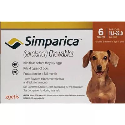 Usage: *For complete Description, please review the full prescribing information in the manufacturer package insert. Simparica Chewables should be given orally at monthly intervals year–round, or as otherwise directed by your veterinarian. Manufacturer recommended usage: Simparica (sarolaner) Chewables are given orally once a month at the recommended minimum dosage of 0.91 mg⁄lb (2 mg⁄kg). Simparica Chewables can be offered by hand, in the food, or administered like other tablet medications. Care should be taken that the dog consumes the complete dose, and treated animals should be observed for a few minutes to ensure that part of the dose is not lost or refused.
