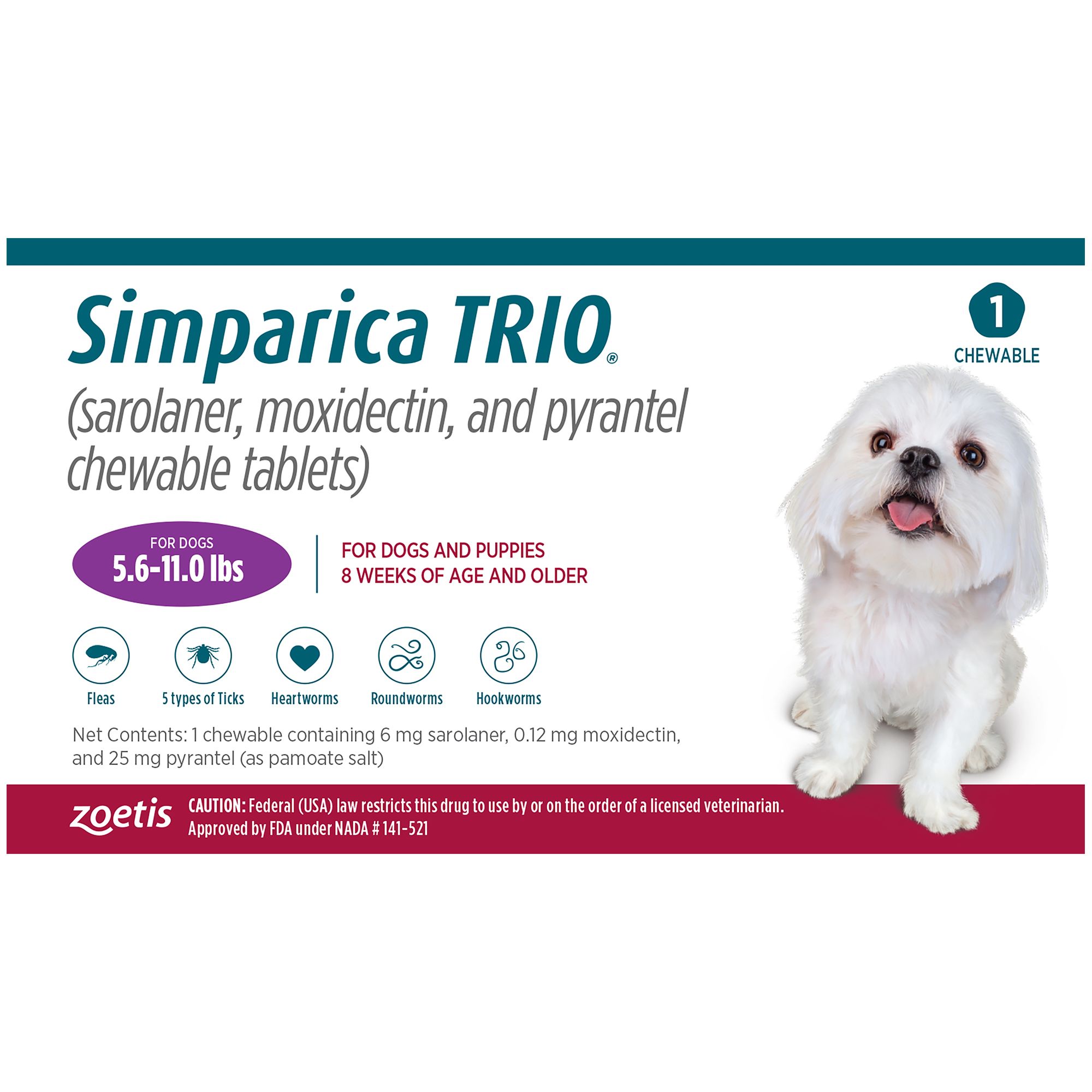 Product Strength & Size: Weight RangeSarolaner (per tablet)Moxidectin (per tablet)Pyrantel (per tablet)2.8 to 5.5 lbs3 mg0.06 mg12.5 mg5.6 to 11 lbs6 mg0.12 mg25 mg11.1 to 22 lbs12 mg0.24 mg50 mg22.1 to 44 lbs24 mg0.48 mg100 mg44.1 to 88 lbs48 mg0.96 mg200 mg88.1 to 132 lbs72 mg1.44 mg300 mg*For dogs over 132 lbs, administer the appropriate combination of tablets to cover your petâs body weight.Usage*For complete product information, please review the full prescribing information in the manufacturer package insert.Simparica Trio should be given orally at monthly intervals year–round, or as otherwise directed by your veterinarian.Do NOT remove tablets from the foil blister pack until just before administration. The sealed blister pack should be kept in its original box⁄packaging for protection from environmental factors (e.g., light, moisture).Manufacturer Dosage and Administration:Simparica Trio is given orally once a month, at the recommended minimum dose of 0.54 mg⁄lb (1.2 mg⁄kg) sarolaner, 0.011 mg⁄lb (24 üg⁄kg) moxidectin, and 2.27 mg⁄lb (5 mg⁄kg) pyrantel (as pamoate salt).Simparica Trio can be offered to the dog with or without food.Care should be taken to ensure that the dog consumes the complete dose and that part of the dose is not lost or refused.Missed dosesIf a dose is missed: give Simparica Trio immediately to resume monthly dosing and notify your veterinarian. Do not give two doses at once.If multiple doses have been missed, consult your veterinarian prior to restarting the monthly dosing schedule.StorageStore in a cool, dry place at a controlled room temperature (at or below 86°F). Keep out of the reach of children and pets. Tablets should remain sealed in their original packaging and should only be taken out of the blister pack at the time of dosing. Store away from heat and direct sunlight.Do not store this medication in the bathroom, near the kitchen sink, or in damp places. The medicine may break down if exposed to heat or moisture.Side effectsSimparica Trio is generally well tolerated, and side effects are considered uncommon when given at the recommended dosage. The most common side effects of this medication are vomiting, diarrhea, decreased appetite, and lowered energy level.Contact your veterinarian immediately if you notice your pet has a seizure, tremors, extreme weakness, or decreased coordination (e.g., stumbling, difficulty walking).Notify your veterinarian if your pet experiences any of the effects described above, or if you notice any other side effects that are persistent or troublesome.If you notice anything unusual, please consult your veterinarian.Precautions*For complete product information including warnings and precautions, please refer to the manufacturer package insert.For oral use in dogs only– not for use in humans.Sarolaner is a member of the isoxazoline class. This class has been associated with neurologic adverse reactions including tremors, ataxia, and seizures. Seizures have been reported in dogs receiving isoxazoline class drugs, even in dogs without a history of seizures. Use with caution in dogs with a history of seizures or neurologic disorders.Prior to administration of Simparica Trio, dogs should be tested for existing heartworm infections. Infected dogs should be treated with an adulticide to remove adult heartworms. Simparica Trio is not effective against adultD. immitis.The safe use of Simparica Trio has not been evaluated in breeding, pregnant, or lactating dogs. Discuss the risks of using this medication with your veterinarian if your pet is in one of these groups.Do not administer to animals with a known history or suspected allergy⁄hypersensitivity to this medication or any of its ingredients. Allergic reactions to medications may occur. Be sure to inform Vetsource and your veterinarian if your pet has any known drug sensitivities or allergies.If your pet displays symptoms of an allergic reaction, discontinue therapy and call your veterinarian immediately or seek emergency veterinary attention. Symptoms may include (but are not limited to): swollen lips, tongue, face, or airways, difficulty breathing, agitation, profuse salivation, and widespread hives or itching.Drug and food interactionsThere are no documented drug or food interactions with Simparica Trio.*NOTE: this may not be a comprehensive list. Contact your veterinarian if your pet experiences any unusual reactions when different medications are given together.Please ensure your veterinarian is aware of all medications and supplements that your pet is currently receiving. Your veterinarian may prescribe multiple medications, even if a potential drug interaction may occur. In these instances, your veterinarian may adjust the dosages or monitor your pet more closely.Adverse reactionsIf you are concerned that your pet has experienced an adverse