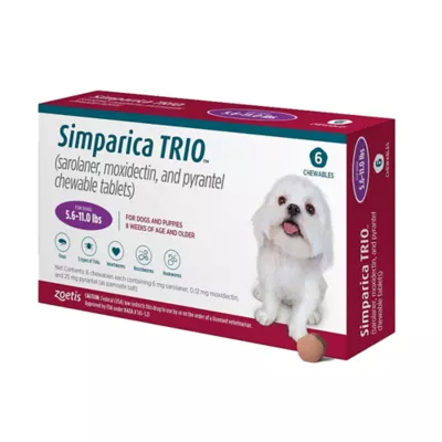 Precautions: *For complete Description including warnings and precautions, please refer to the manufacturer package insert. For oral use in dogs only– not for use in humans. Sarolaner is a member of the isoxazoline class. This class has been associated with neurologic adverse reactions including tremors, ataxia, and seizures. Seizures have been reported in dogs receiving isoxazoline class drugs, even in dogs without a history of seizures. Use with caution in dogs with a history of seizures or neurologic disorders. Prior to administration of Simparica Trio, dogs should be tested for existing heartworm infections. Infected dogs should be treated with an adulticide to remove adult heartworms. Simparica Trio is not effective against adultD. immitis. The safe use of Simparica Trio has not been evaluated in breeding, pregnant, or lactating dogs. Discuss the risks of using this medication with your veterinarian if your pet is in one of these groups. Do not administer to animals with a known history or suspected allergy⁄hypersensitivity to this medication or any of its ingredients. Allergic reactions to medications may occur. Be sure to inform Vetsource and your veterinarian if your pet has any known drug sensitivities or allergies. If you