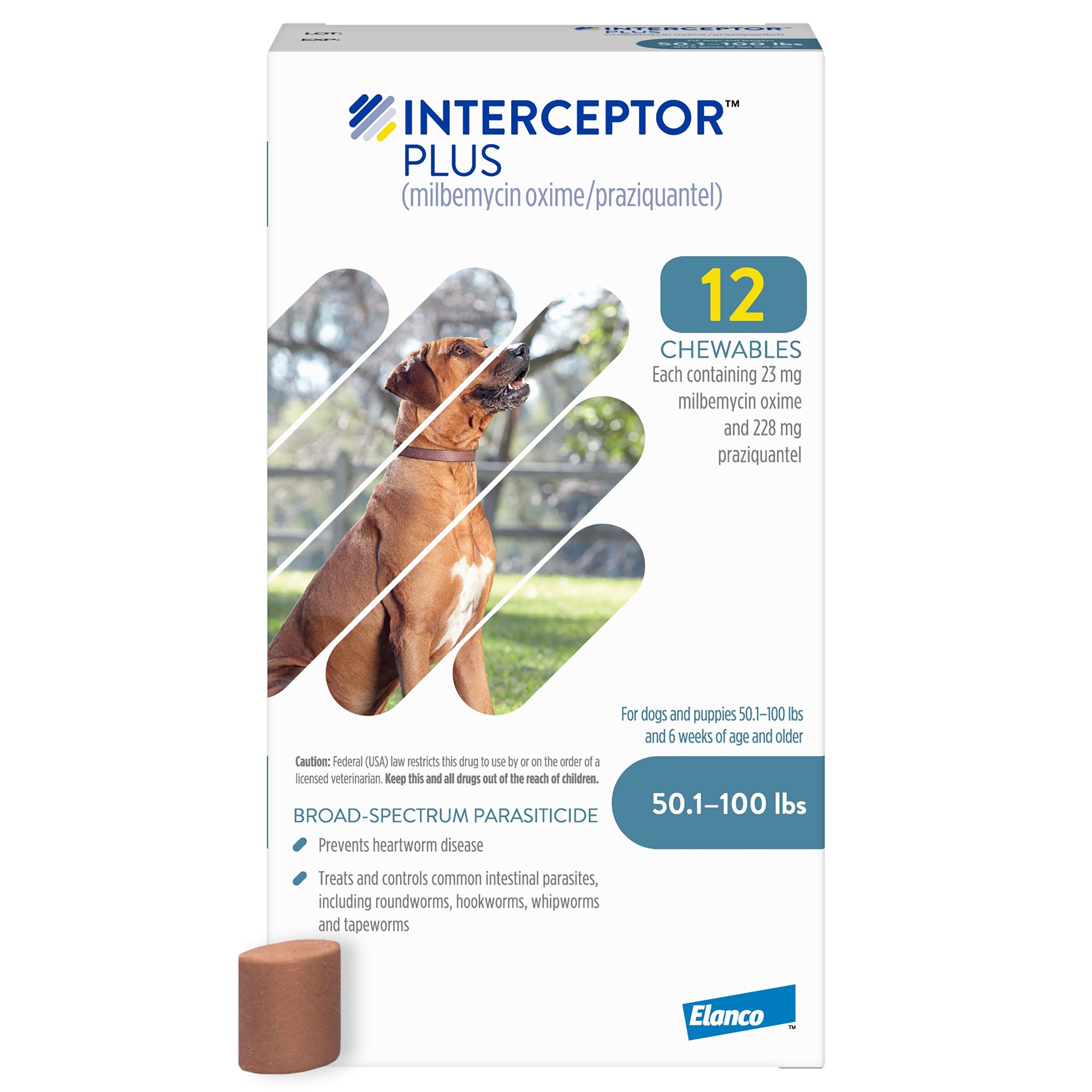Usage: *For complete product information, please review the full prescribing information in the manufacturer package insert. Manufacturer Dosage and Administration: Interceptor Plus should be administered orally, once every month, at the minimum dosage of 0.23 mg⁄lb (0.5 mg⁄kg) milbemycin oxime, and 2.28 mg⁄lb (5mg⁄kg) praziquantel. For heartworm prevention, give once monthly for at least 6 months after exposure to mosquitoes. Interceptor Plus may be offered to the dog by hand or added to a small amount of dog food. The chewables should be administered in a manner that encourages the dog to chew, rather than to swallow without chewing. Chewables may be broken into pieces and fed to dogs that normally swallow treats whole. Care should be taken that the dog consumes the complete dose, and treated animals should be observed for a few minutes after administration to ensure that no part of the dose is lost or rejected. If it is suspected that any of the dose has been lost, redosing is recommended.