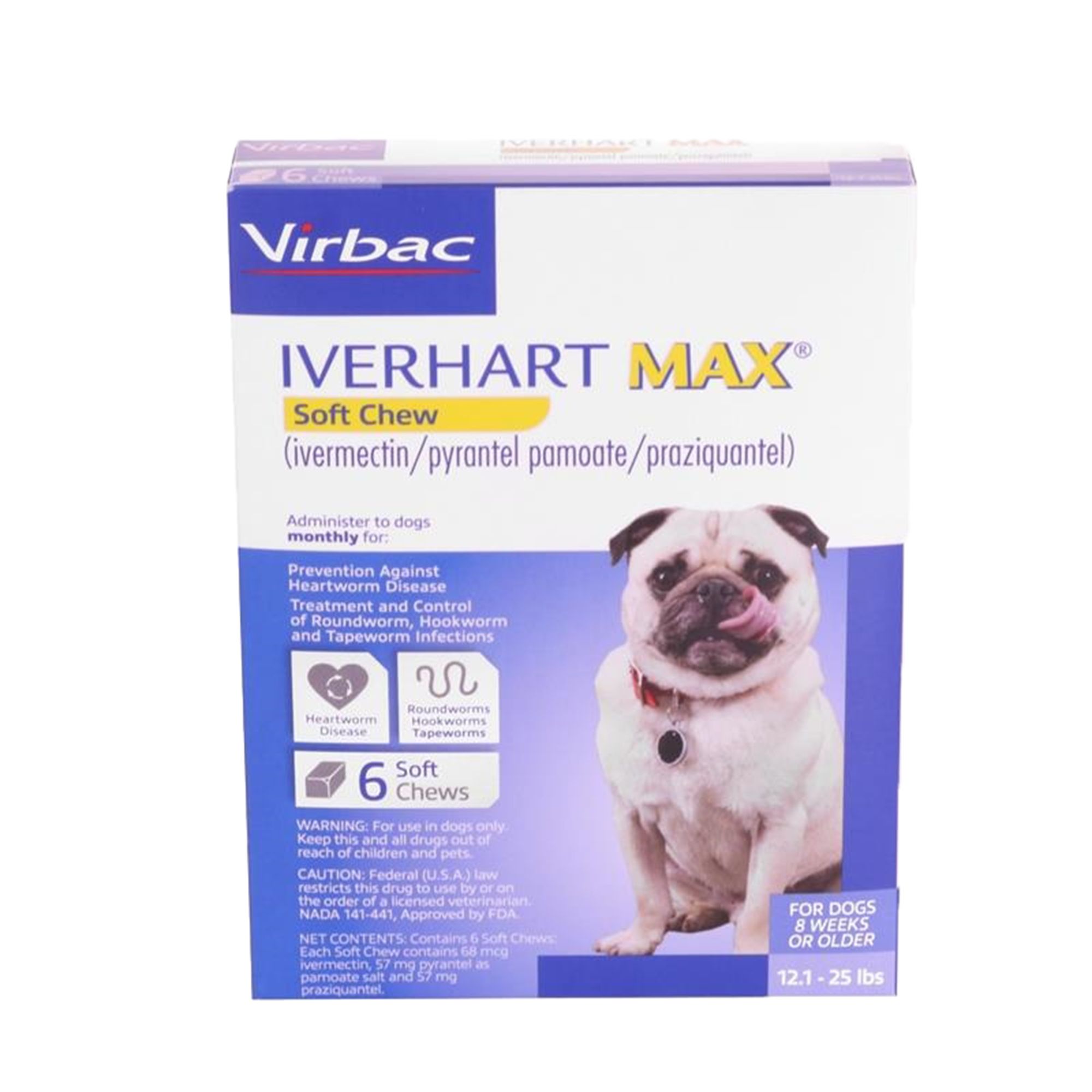 Once a month bacon flavored chewable tablet that is highly palatable Treats and controls roundworms (T. canis, T. leonina) and hookworms (A. caninum, U. stenocephala, A. braziliense) and tapeworms (D. caninum, T. pisiformis) once monthly when given routinely T. canis, T. leonina A. caninum, U. stenocephala, A. braziliense D. caninum, T. pisiformisWhen given at the recommended dose and regimen, Iverhart Max® Soft Chews is effective against the tissue larval stage of heartworm larvae for a month after infection resulting in the prevention of adult heartwormsApproved for dogs 8+ weeks of age, weighing more than 6 pounds