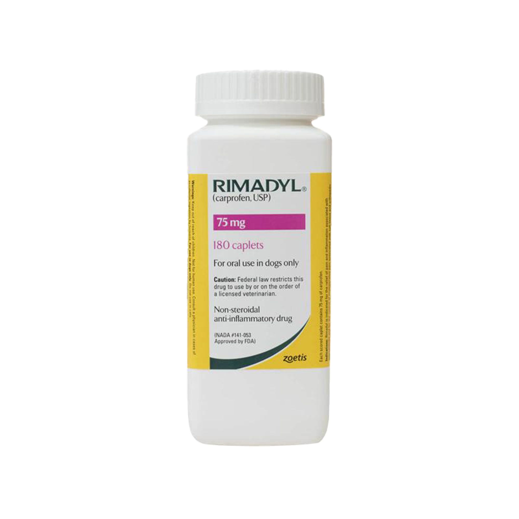 Product Description & Form: Rimadyl® Caplets 25 mg 30 ct, 60 ct & 180 ct: 12 mm, orange (yellow orange to peach), oval (capsule shaped, biconvex caplet), scored in half, imprinted with RIMADYL;25MG. (NDC 54771–8461–01, 54771–8461–02 & 54771–8461–03) Rimadyl® Caplets 25 mg 30 ct, 60 ct & 180 ct Rimadyl® Caplets 75 mg 30 ct, 60 ct & 180 ct: 15 mm, orange (yellow orange to peach), oval (capsule shaped, biconvex caplet), scored in half, imprinted with RIMADYL;75MG. (NDC 54771–8463–01, 54771–8463–02 & 54771–8463–03) Rimadyl® Caplets 75 mg 30 ct, 60 ct & 180 ct Rimadyl® Caplets 100 mg 30 ct, 60 ct & 180 ct: 19 mm, orange (yellow orange to peach), oval (capsule shaped, biconvex caplet), scored in half, imprinted with RIMADYL;100MG. (NDC 54771–8465–01, 54771–8465–02 & 54771–8465–03) Rimadyl® Caplets 100 mg 30 ct, 60 ct & 180 ct