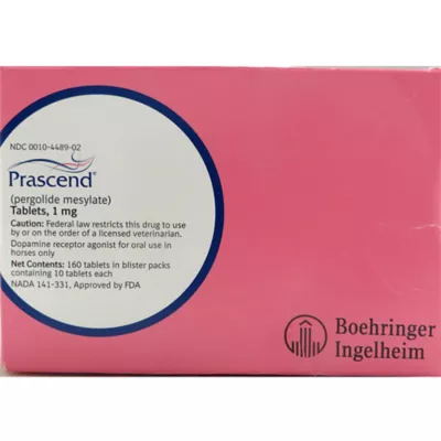 Precautions: Before using this product, please review the product label and package insert for important safety information, including any relevant warnings and precautions. For oral use in horses only. Not for use in humans. Not for use in horses intended for human consumption. Pregnant or lactating women should wear gloves when administering this product. PRASCEND tablets should not be crushed due to the potential for increased human exposure. Keep PRASCEND in a secure location out of reach of dogs, cats, and other animals to prevent accidental ingestion or overdose. Dogs have eaten PRASCEND tablets that were placed in food intended for horses or dropped during administration of the tablets to the horses. Adverse reactions may occur if animals other than horses ingest PRASCEND tablets. The use of PRASCEND in breeding, pregnant, or lactating horses has not been evaluated. The effects of pergolide mesylate on breeding, pregnant, or lactating horses are not known; however, the pharmacologic action of pergolide mesylate suggests that it may interfere with reproductive functions such as lactation. Do not administer this medication to horses with a known or suspected allergy⁄hypersensitivity to any ergot derivative, including pergolide mesylate, or any of its ingredients. Allergic reactions to medications may occur. Please inform Vetsource and your veterinarian if your pet has any known sensitivities or allergies, especially to medications and supplements. If your pet displays symptoms of an allergic reaction, discontinue therapy and call your veterinarian immediately or seek emergency veterinary attention. Symptoms may include (but are not limited to): swollen lips, tongue, face, or airways; difficulty breathing; agitation; profuse salivation; and widespread hives or itching.