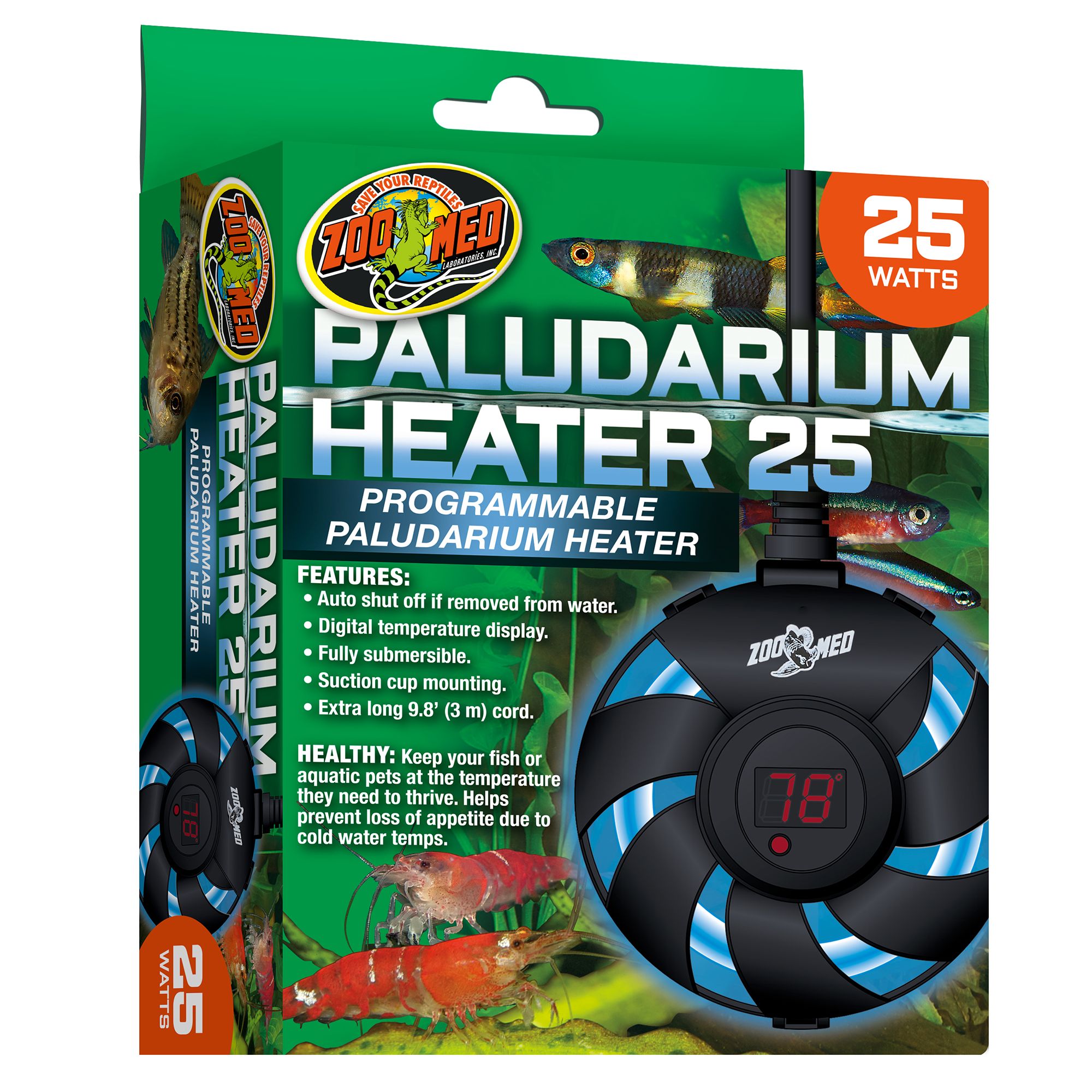 Specially-designed for aquatic reptile environments, Tetrafauna Aquatic Reptile Heater is designed to keep your frogs, newts and turtles comfortable, with an automatic thermostat that maintains an optimum water temperature of 78 degrees. This compact, submersible heater features a protective cover to keep pets safe. An extra-long, 8-foot cord easily adapts to any direction, allowing a more custom fit to your terrarium - just unsnap the cover, position the cord through one of several openings, then snap closed. Two oversized suction cups provide maximum hold to prevent movement by active reptiles. This device heats up to 30 gallons of water.