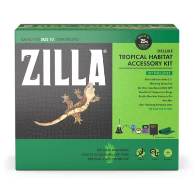 Set yourself and your new reptile up for success with the Zilla Habitat Accessory Kit. Designed to help you and your new reptile get off to a happy and healthy start, these starter kits feature the essential components your habitat will need. Each kit is catered to a different kind of habitat and the unique needs of the reptile or environment specified. The kits are available for tropical-dwelling reptiles, desert-dwelling reptiles, snakes, aquatic turtles and bearded dragons. Depending on the type of kit and the unique needs of the habitat, each kit will provide you with the essentials for lighting, heat and bedding, and may include a humidity and temperature gauge if the habitat requires. The Tropical Habitat Accessory Kit comes with lighting, heat, bedding, a humidity and temperature gauge, food and feeding dish, providing a complete solution for creating a worry-free and optimal habitat for juvenile tropical-dwelling reptiles. There is also an easy step-by-step setup guide to help make setting up your pet's habitat simple and stress-free. Pair the kit with the perfect enclosure that fits your reptile and their needs for the perfect happy and healthy start to your reptile's new home. Celebrate your pet and Rep Yourself, with Zilla.