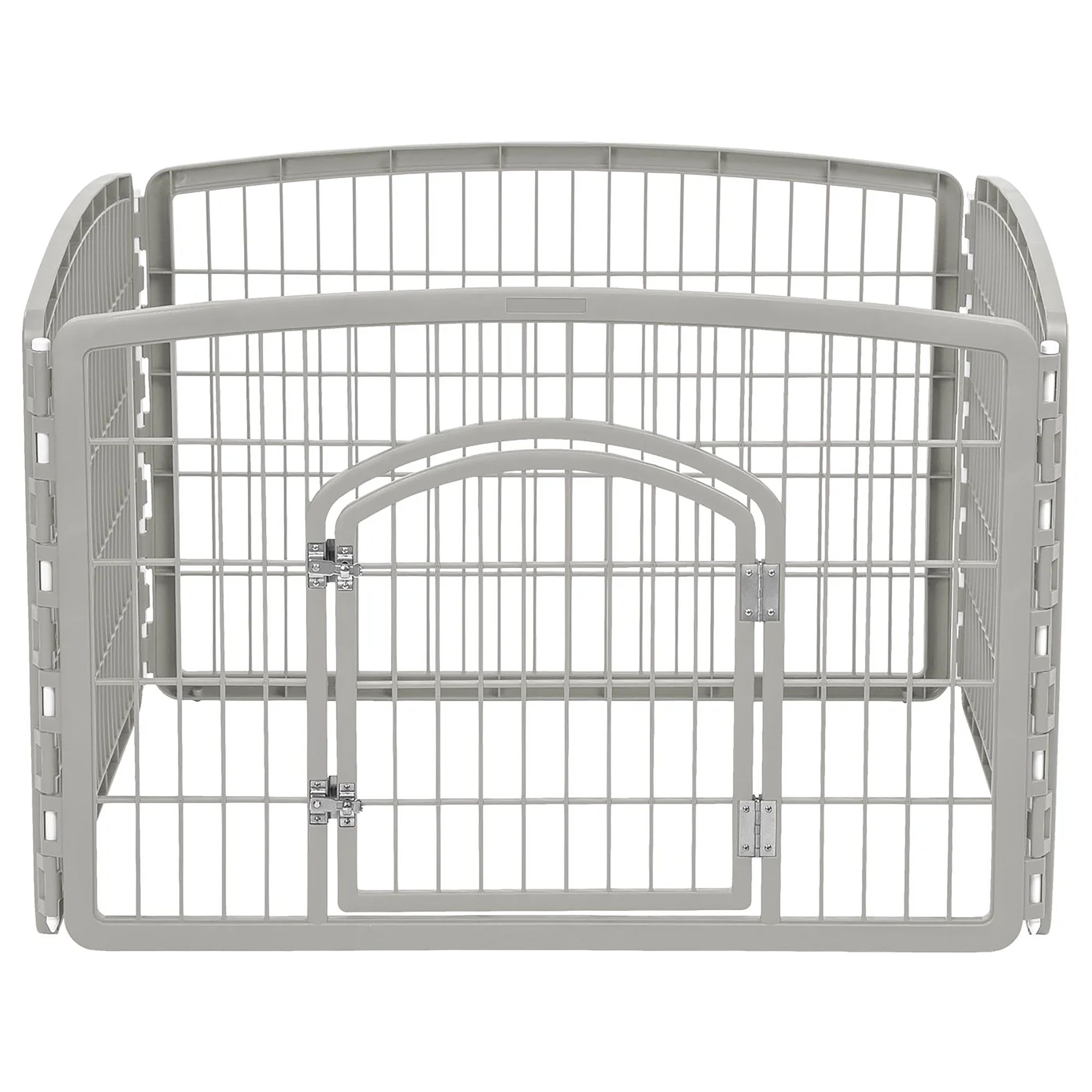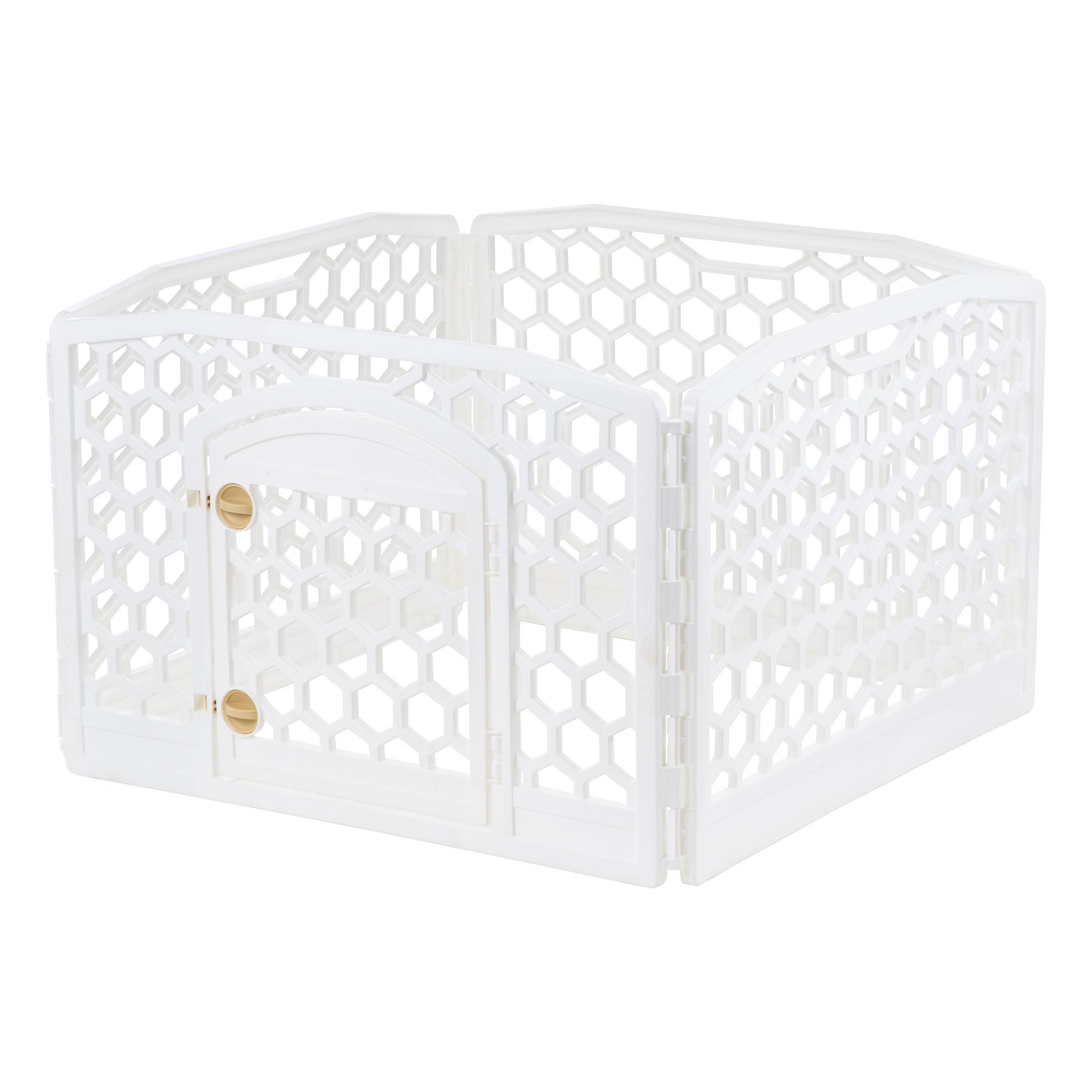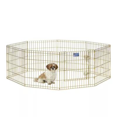 The 24"W x 24"H gold MidWest Exercise Pen provides a secure 16 sq ft enclosure for your pet. Exercise pens by MidWest are easy to set-up with no tools required and come with a convenient door. These exercise pens can latch onto the door of a dog crate to provide your pet with the freedom to move and play while adding the security and comfort of their dog crate. Because life goes