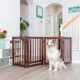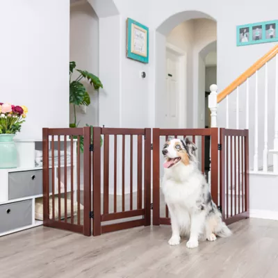 DescriptionThe Primetime Petz 360 Configurable Dog Gate is a 100% wooden, freestanding pet gate that makes an elegant addition to any pet owner's home. Featuring a 360 degree hinge design, this versatile walk-through gates let you design your pet's roaming space in countless ways. Max span 72 inches. Max span with Support Feet (additional purchase) 80 inches.