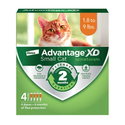 Cat lovers choose Advantage XD for double the lasting protection against fleas vs. other 1-month options. Advantage XD for small cats and kittens packs two full months of treatment and continuous protection in each dose, so your cat is protected for longer than the traditional 1-month formula. If your cat has already tousled with fleas, you'll love that Advantage XD topical treatment starts killing fleas through contact in 30 minutes to 4 hours - that means fleas can be eliminated before they bite your cat. And with Advantage XD extended duration formula, that flea prevention remains effective for 8 weeks, outlasting the typical 6-week flea life cycle and preventing reinfestation. Find Advantage XD topical flea treatment available in a variety of pack sizes, from 2 months protection (1 dose), to 4 months protection (2 doses), or 8 months protection (4 doses). This fragrance-free formula contains Spinetoram, a naturally derived, Green Chemistry Award-winning* ingredient. Advantage XD flea infestation prevention is effective on both indoor and outdoor cats. Your cat should be at least 8 weeks old and between 1.8 and 9 lbs. to use Advantage XD for small cats. Even with the squirmiest of kittens and cats, application is easy. This single, topical, spot-on application goes on the back of your catâs neck at the base of the skull. You'll simply place the tip of the tube on the skin and squeeze the tube to expel the entire contents directly on the skin. It's easier than a flea collar, and there are no hard-to-swallow pills; this topical treatment goes on in seconds. See product label for more information. For the ultimate convenience in care, Advantage XD is available over the counter - no prescription needed. Once Advantage XD is applied, your cat is ready to get right back to exploring the outdoors or finding a cozy spot for a nap, while you get to enjoy peace of mind. *US EPA Presidential Green Chemistry Challenge. Designing Greener Chemicals Award. 2008.