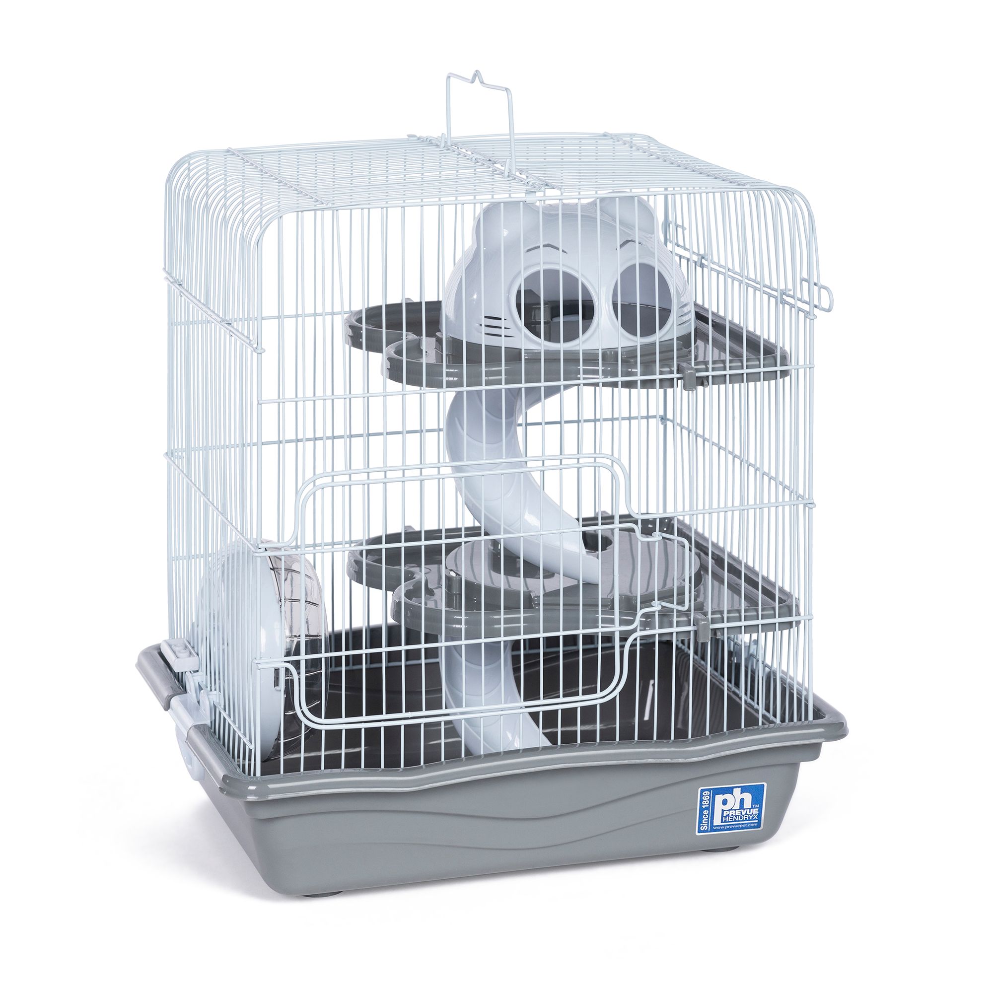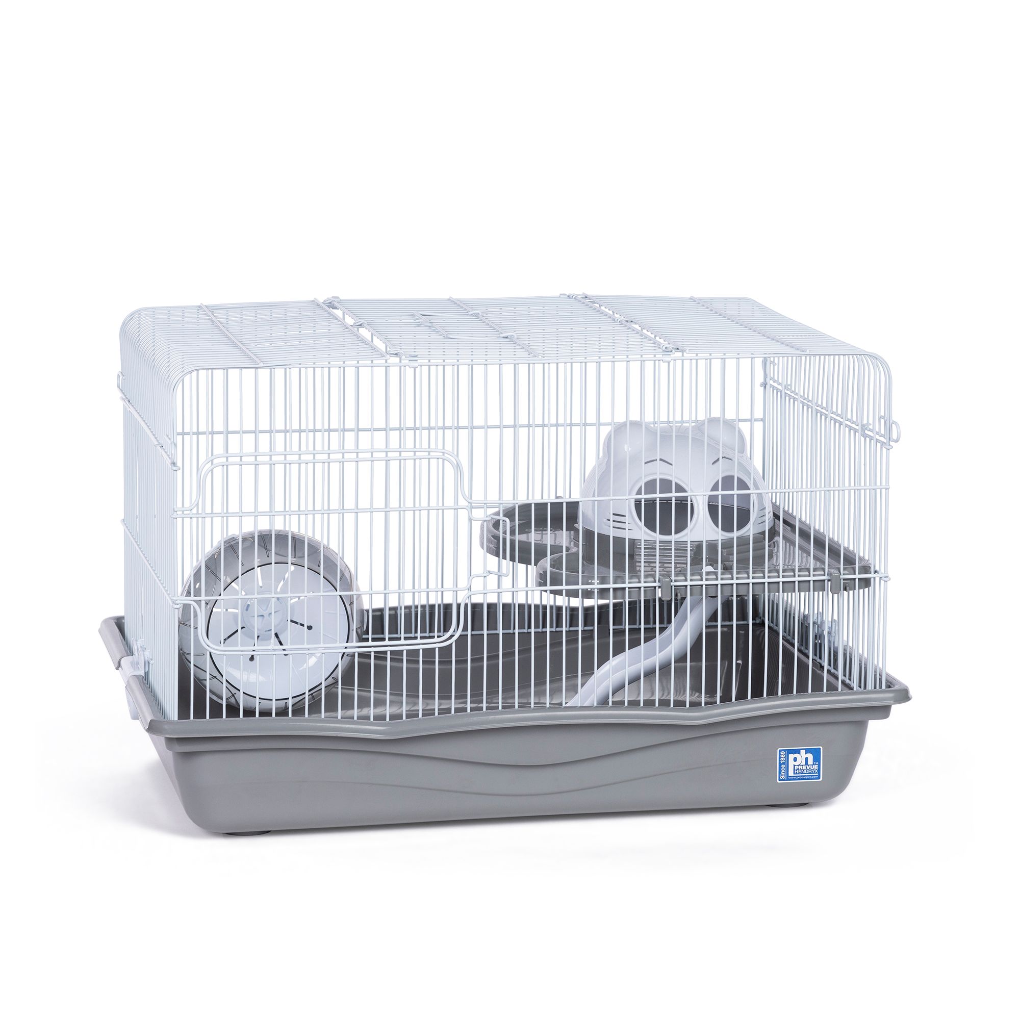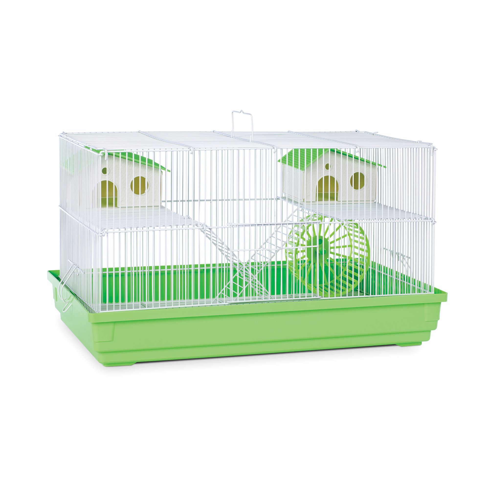 Features: Give your mouse, gerbil, or hamster a three–level home to play in and explore. Two platforms with ramps maximizes vertical cage space and gives active pets places to explore. Hideaway house offers a safe place to nap and nest. The exercise wheel lets pets really run. Additional accessories include a food dish and water bottle. Two cage access points: rooftop door and large front–panel fold–down door. Carrying handles for transport.